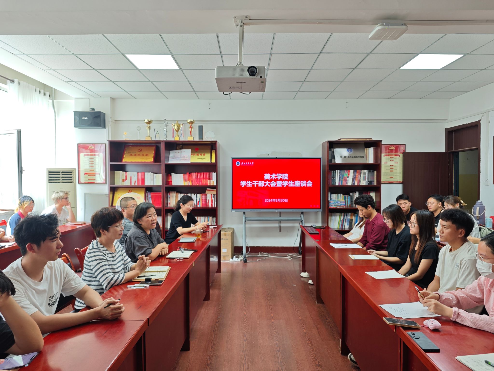 為提高學生干部的素質能力,更好地發揮模范帶頭作用, 2024年8月30日下午,美術學院在美術樓209會議室召開學生干部大會暨學生座談會,院長徐海翔、副書記鐵英秀、副院長馮炳超及學生干部參加,會議由團委書記王媛媛主持。