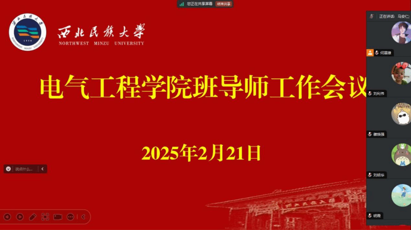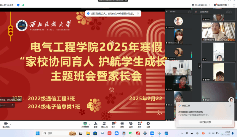 為形成家校育人合力,助力學(xué)生全面發(fā)展,2月21日至23日,電氣工程學(xué)院召開2025年“家校協(xié)同育人 護(hù)航學(xué)生成長”線上主題班會(huì)暨家長會(huì),與學(xué)生和家長進(jìn)行交流,了解學(xué)生思想動(dòng)態(tài)、假期學(xué)習(xí)和生活狀況,并對(duì)開學(xué)前相關(guān)工作進(jìn)行了提醒。學(xué)院處級(jí)干部、輔導(dǎo)員、班導(dǎo)師與62個(gè)班級(jí)2400余名學(xué)生及家長相聚云端,共繪成長藍(lán)圖。
