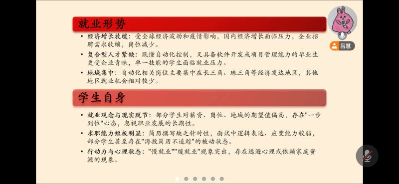學(xué)院黨委對(duì)此次線上主題班會(huì)暨家長會(huì)給予了高度重視,召開專題班導(dǎo)師、輔導(dǎo)員會(huì)議,精心策劃了工作方案。畢業(yè)班級(jí)聚焦就業(yè)觀念轉(zhuǎn)變、職業(yè)能力提升、招聘政策解讀等主題,助力學(xué)生搶占“金三銀四”就業(yè)窗口期,實(shí)現(xiàn)高質(zhì)量就業(yè);低年級(jí)班級(jí)聚焦精準(zhǔn)賦能,以“學(xué)業(yè)規(guī)劃+職業(yè)啟蒙”為主線,通過案例剖析引導(dǎo)學(xué)生明確個(gè)人發(fā)展路徑,強(qiáng)化專業(yè)認(rèn)知與核心競爭力培養(yǎng)。
