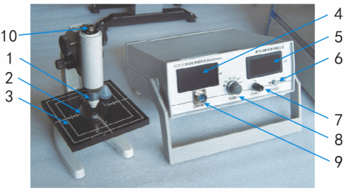 1、四探針測(cè)試頭 2、被測(cè)樣品 3、測(cè)試臺(tái)面 4、數(shù)字電壓表 5、數(shù)字電流表