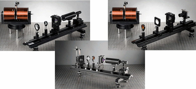 實(shí)驗(yàn)儀主要由磁鐵、窄帶干涉濾光片、會(huì)聚透鏡、F-P標(biāo)準(zhǔn)具、偏振片(帶轉(zhuǎn)盤)、成像裝置、筆形汞燈及電源等組成,實(shí)物如圖。