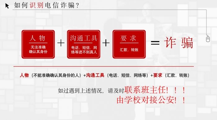 班會聚焦電信網絡詐騙類型、具體方式和防范措施三方面展開,各班主任緊密結合典型案例細致講解了電信網絡詐騙形式、作案特點,以及如何識別網絡詐騙、如何保護個人信息、如何保護個人財物等等,呼吁大家爭做“防詐宣傳員”“反詐行動者”,積極向身邊親友宣傳反詐防詐知識,共同筑牢防范網絡電信詐騙的“防火墻”。