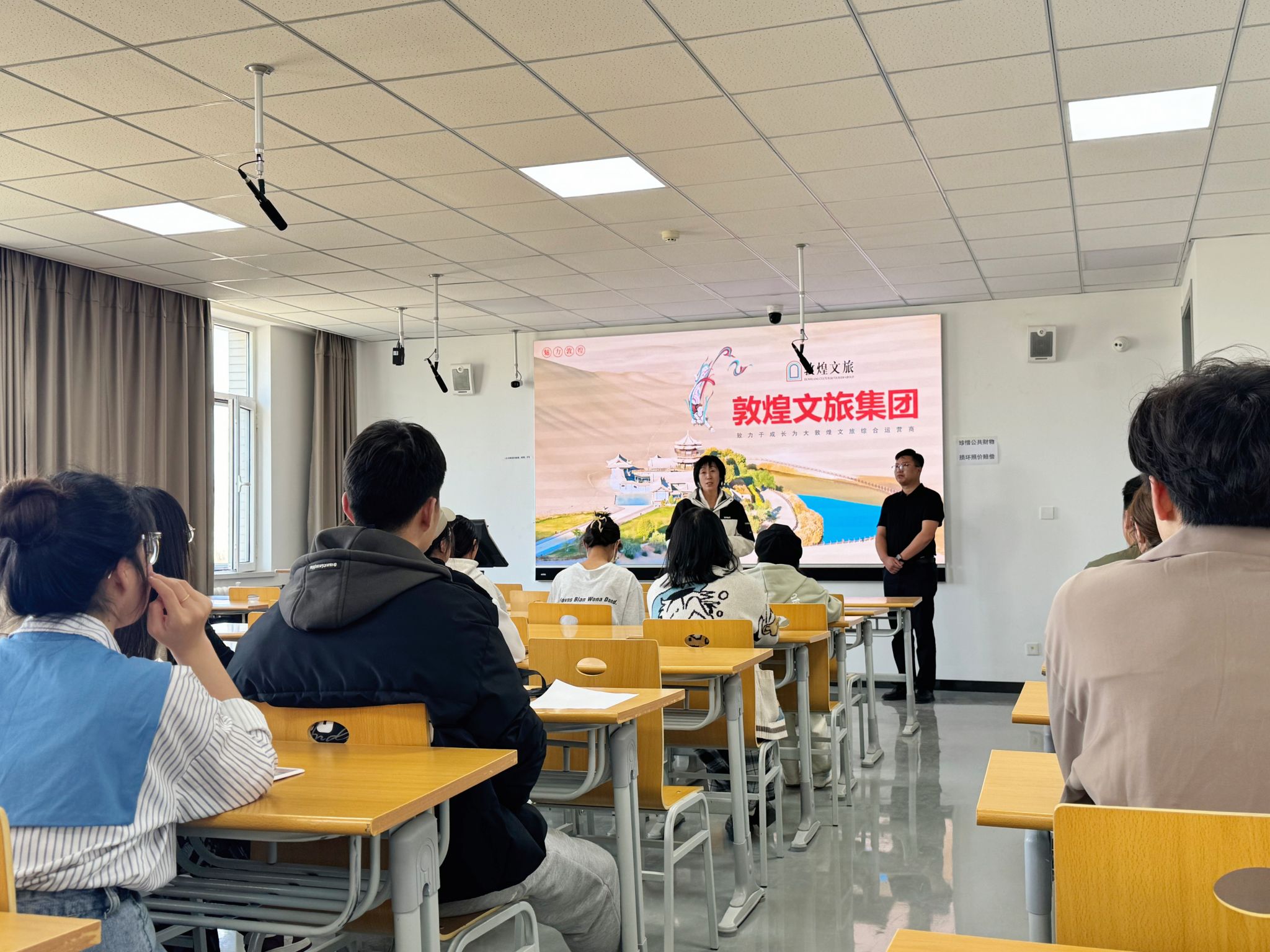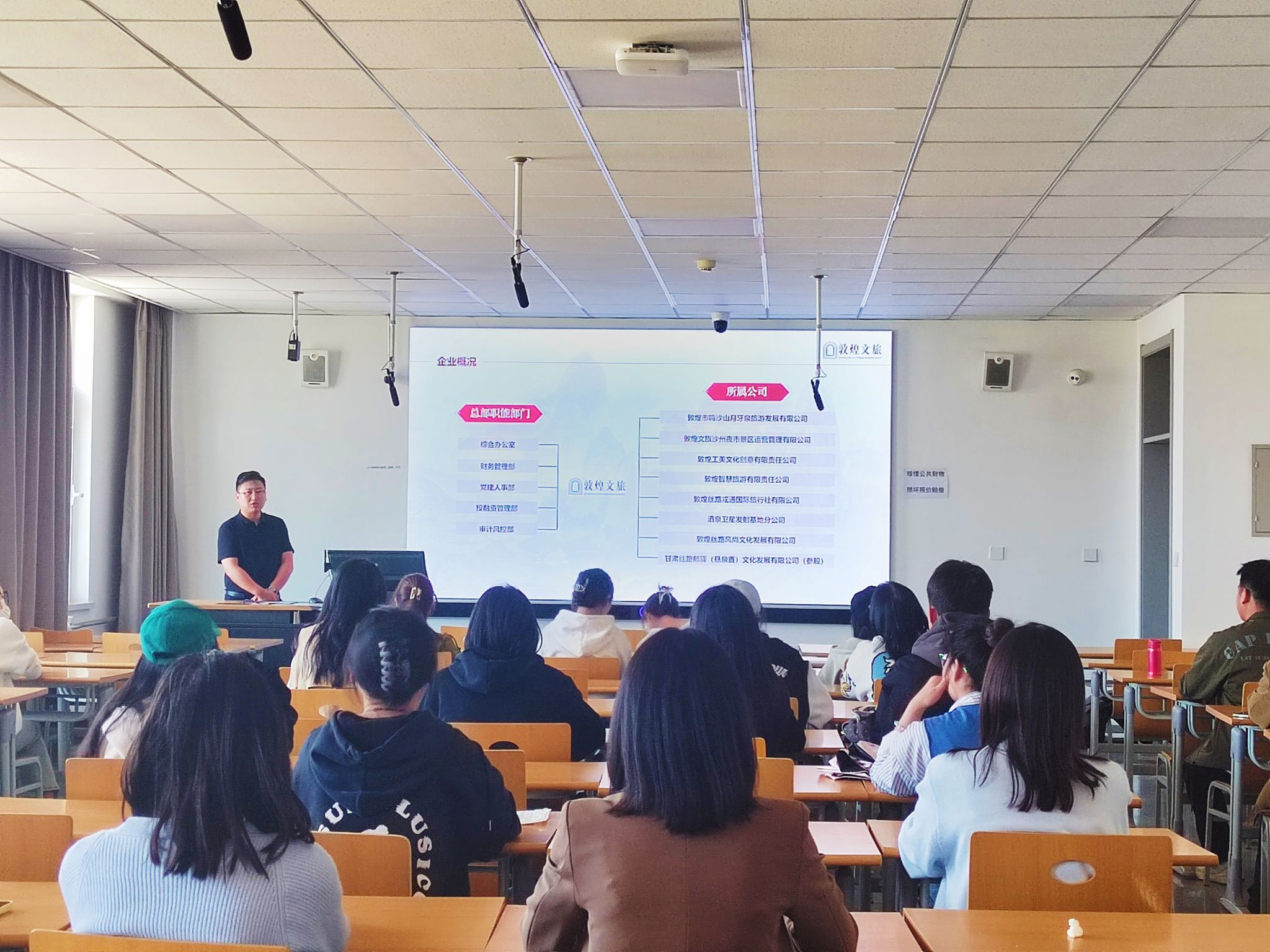 在宣講環節,王強總經理通過播放視頻、演示PPT、發放宣傳冊等方式,圖文并茂介紹了企業概況和工作業績,并講解公司景區板塊、文創研發板塊、市場營銷推廣板塊、會展賽事策劃板塊、智慧旅游板塊、大敦煌全域旅游開發建設板塊和駐外機構等內容,希望畢業生發揮專業所長,參與到文旅事業中來,一起成為敦煌文化弘揚的服務者、產業發展的推動者。