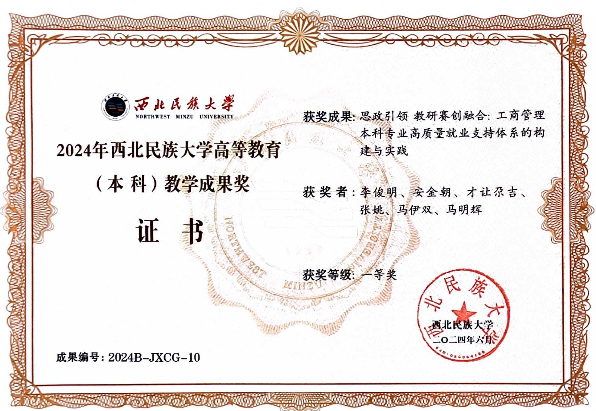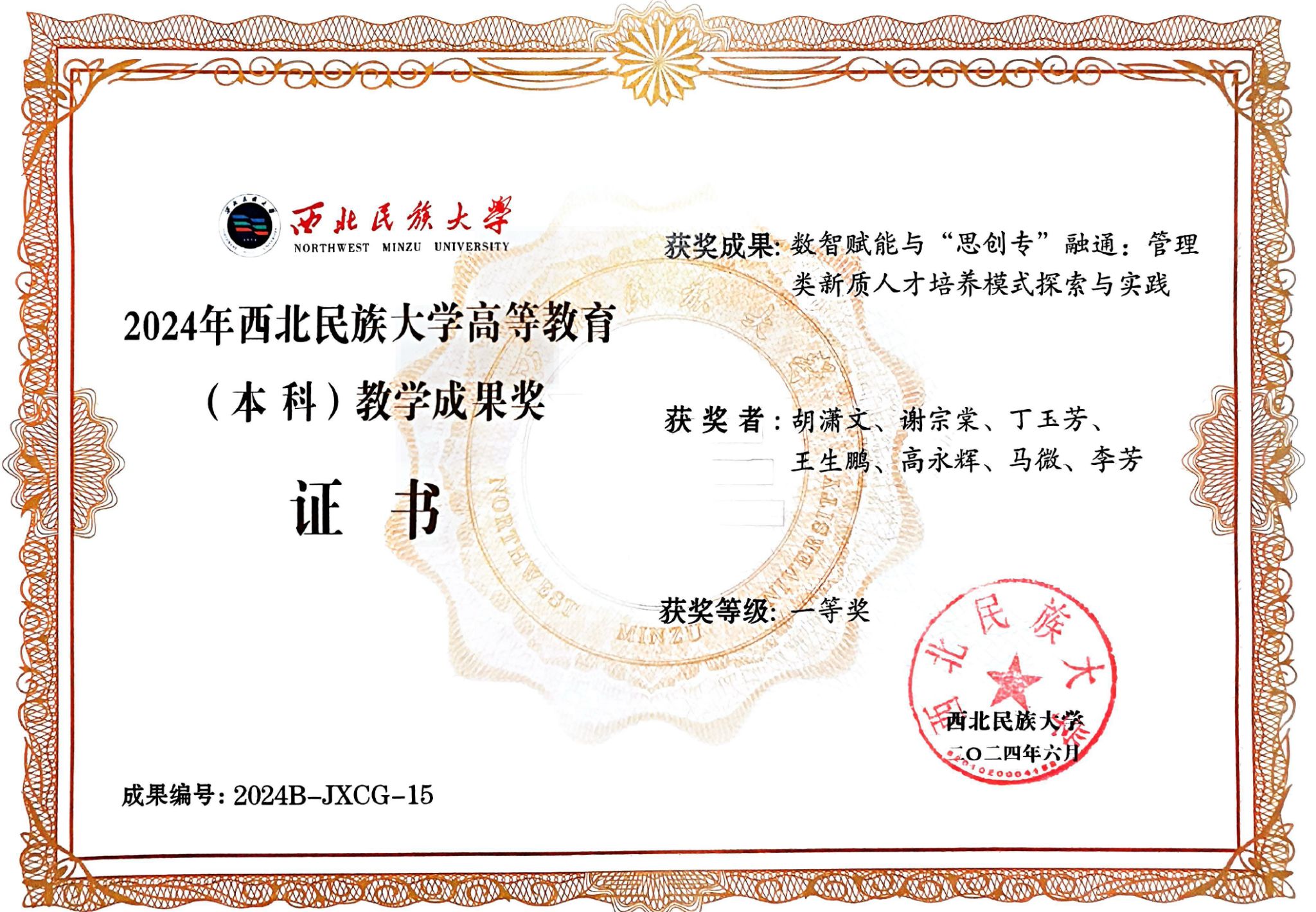 胡瀟文教師團隊自2014年起,緊扣《數(shù)智賦能與“思創(chuàng)專”融通:管理類新質(zhì)人才培養(yǎng)模式探索與實踐》課題,緊密結(jié)合區(qū)域乃至國家的現(xiàn)實需求,以數(shù)字賦能提升教學效率和創(chuàng)新動能,將“思創(chuàng)專”理念、技術(shù)、范式融入人才培養(yǎng)的全方位各環(huán)節(jié)。目前,該教師團隊獲國家民委教學名師獎1項,獲國家社科思政教育課題1項,獲國家級、省級教改項目5項,獲批省級一流專業(yè)2項、省級一流課程1項、省級課程思政項目1項,有校級優(yōu)秀思政教師2名,發(fā)表教改論文10余篇。指導本科生參與各項學科競賽300余人次,獲國家級、省級獎項30項,學生發(fā)表中英文論文近20篇(含CPCI檢索1篇,擬收錄1篇,北大核心收錄論文1篇)。