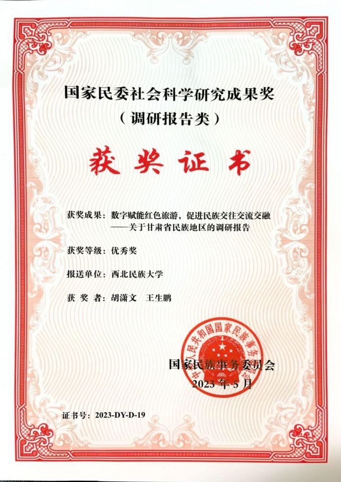 近日,國家民委辦公廳通報了2022年度全國民族工作優秀調研報告評選結果。管理學院胡瀟文、王生鵬兩位老師撰寫的調研報告《數字賦能紅色旅游,促進民族交往交流交融——關于甘肅省民族地區的調研報告》(以下簡稱“《調研報告》”)榮獲國家民委社會科學研究成果獎(調研報告類)優秀獎。