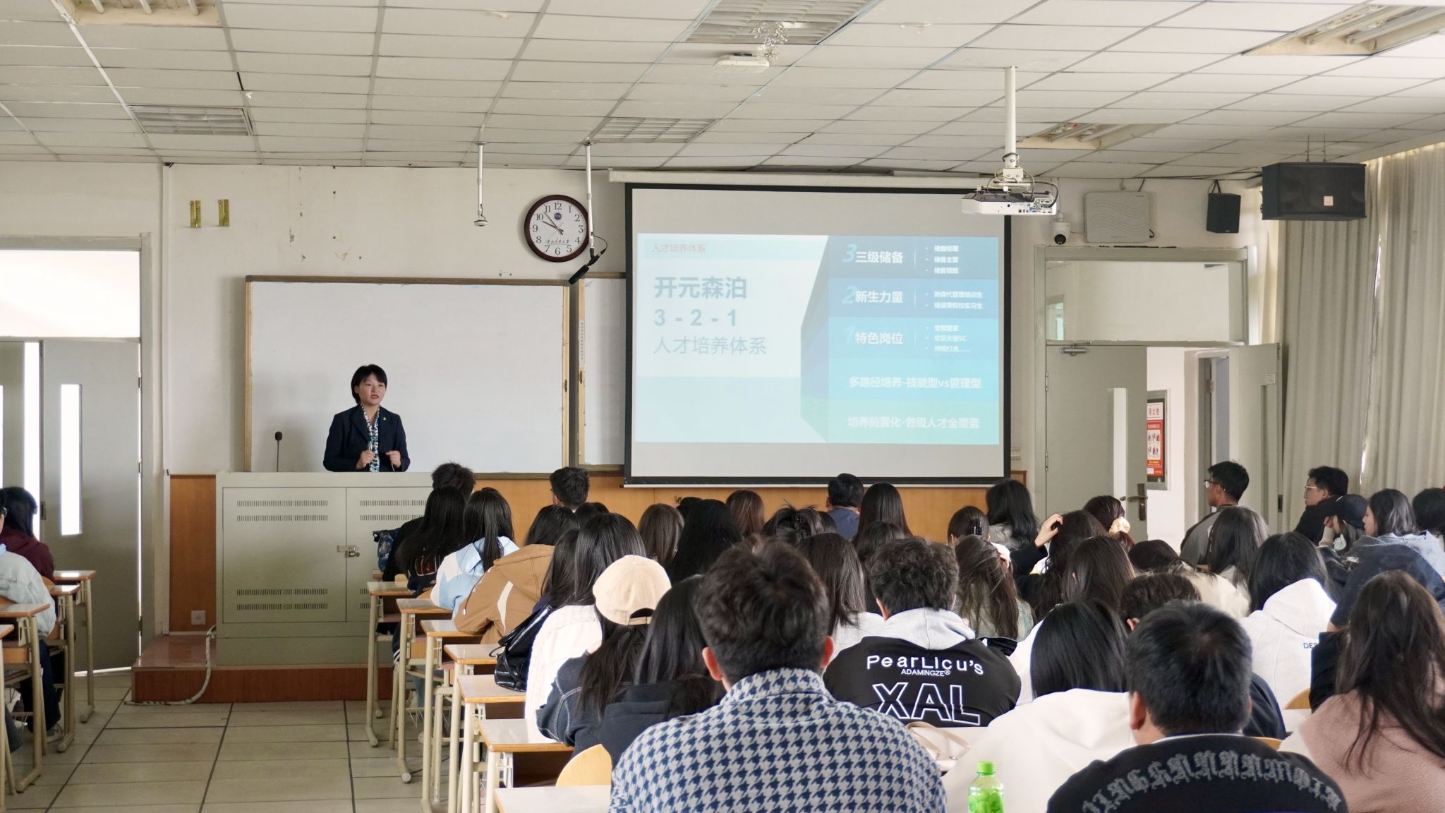 活動伊始,敦煌文旅集團人力資源總監王強,開元森泊總部招聘總監吳燕、嘉興森泊招聘經理王文婭,正大集團甘青寧區人力資源部總監張明喜分別介紹了集團的企業文化、核心業務、實習條件、職業發展路徑等同學們關心關注的事項,細致講解集團的發展定位、崗位需求、任職要求、招聘程序、薪酬待遇,期待與2025屆、2026屆畢業生攜手共進,實現個人價值與企業發展的同頻共振。