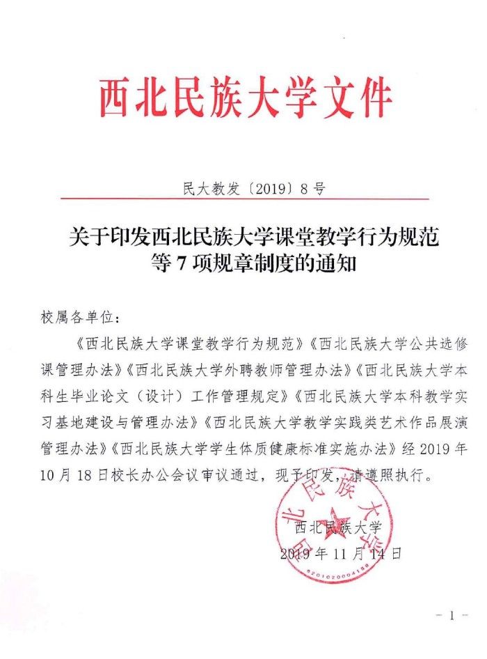 關(guān)于印發(fā)西北民族大學(xué)課堂教學(xué)行為規(guī)范等7項(xiàng)規(guī)章制度的通知