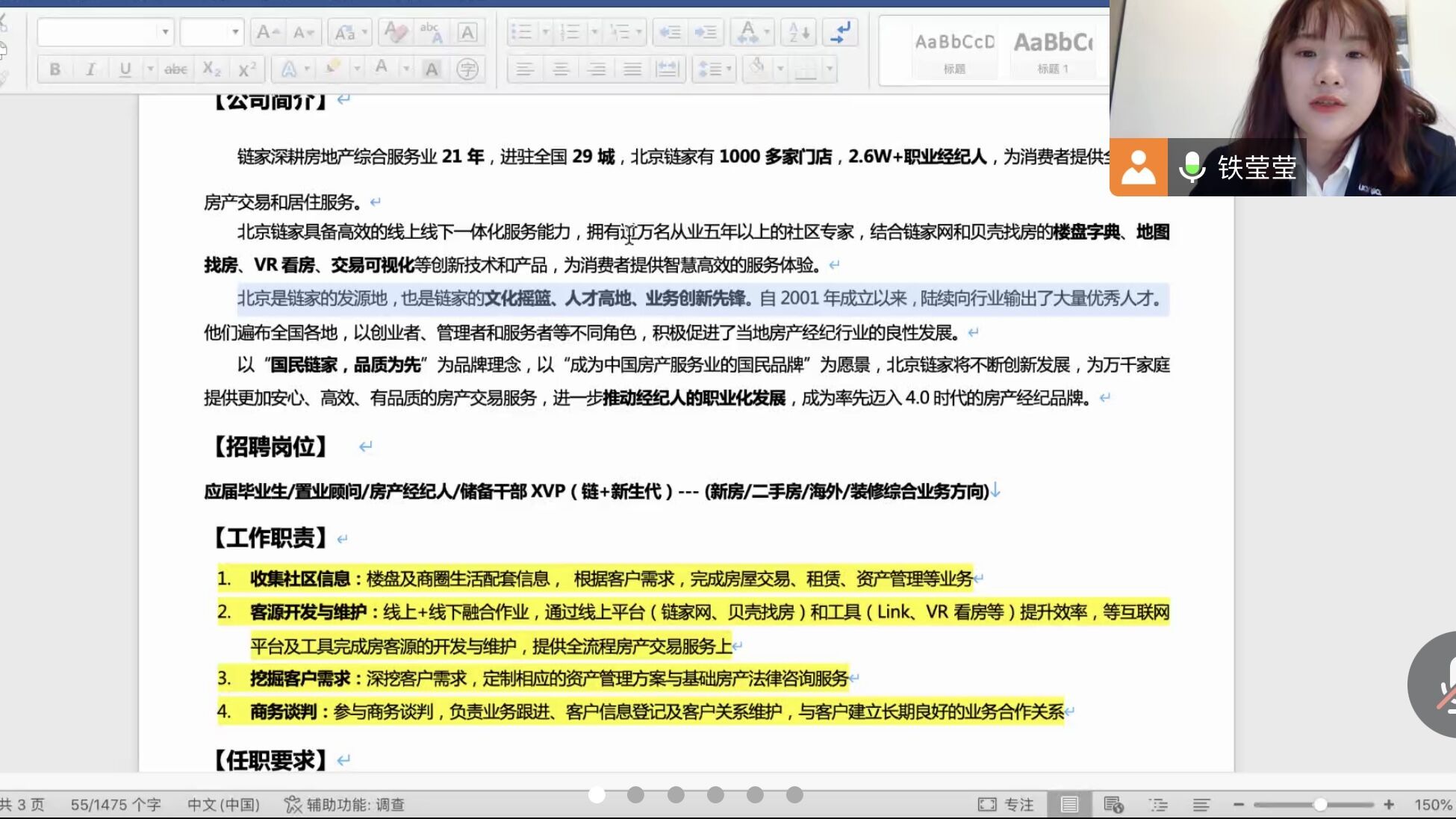 鐵瑩瑩同學現供職于北京鏈家房地產公司,宣講會上,她向與會學生講述了自己畢業后求職擇業以及二戰考研的經歷和感想,突出了職業發展中“目標”的重要性,無論是考研還是找工作,首先要考量的一個問題就是自己的需求和目標。同時,鐵瑩瑩同學還向參會學生介紹了自己供職單位北京鏈家的基本情況,包括工作環境、工資待遇、發展前景等,并向有意向應聘的學生提供了線上應聘和投遞簡歷的通道,重點介紹了單位內推的情況和程序。與會學生積極參與互動,畢業生向鐵瑩瑩同學咨詢了工作地點、應聘和面試等問題。
