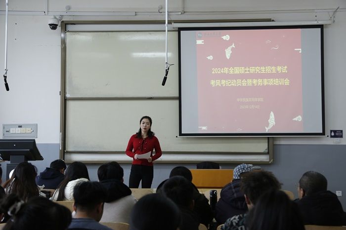 12月14日下午,學院在致真樓313教室組織召開2024年全國碩士研究生招生考試考風考紀動員會暨考務事項培訓會,2020級考研學生參加。輔導員王志強主持會議,學院黨委副書記劉彬同志出席并講話。
