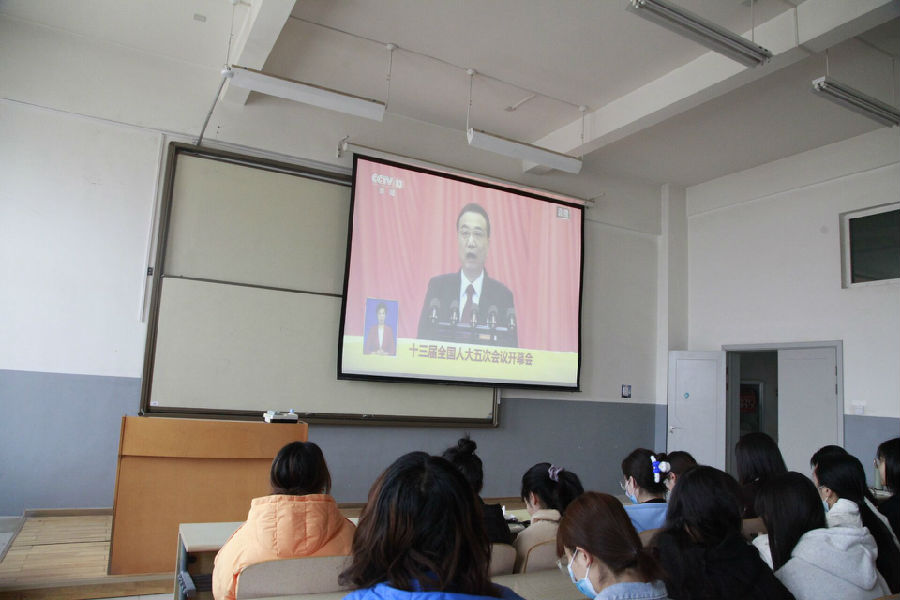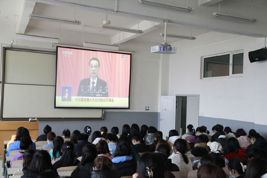 第十三屆全國人民代表大會第五次會議于2022年3月5日上午9時在北京召開。為深入學(xué)習(xí)兩會精神,讓兩會精神深入到學(xué)生們的思想和認(rèn)識中,學(xué)院組織部分學(xué)生代表在榆中校區(qū)致真樓405、406教室通過多媒體收看開幕會直播實(shí)況。