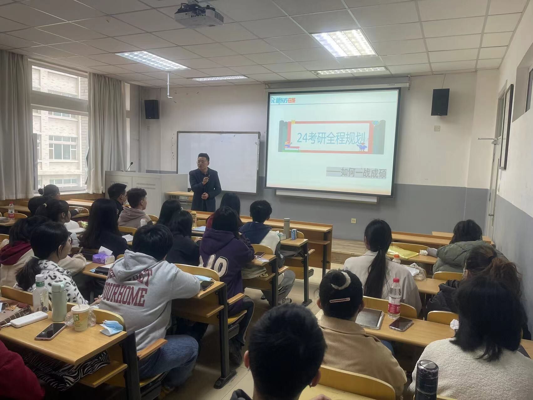 為了給學(xué)院2020級有考研意向的學(xué)子提供更多指導(dǎo),增進(jìn)同學(xué)們對研究生入學(xué)考試的了解,學(xué)院依托春季學(xué)期三年級就業(yè)指導(dǎo)課程平臺,于2023年3月22日、24日上午8:40—10:20分別在致美樓204和致善樓416教室開展兩場主題為《一堂不一樣的就業(yè)指導(dǎo)課——如何一戰(zhàn)成碩》的專題講座。兩場講座特別邀請新東方在線考研全程規(guī)劃師、碩士研究生考試資深顧問、職業(yè)生涯規(guī)劃師付知屹老師進(jìn)行講授。