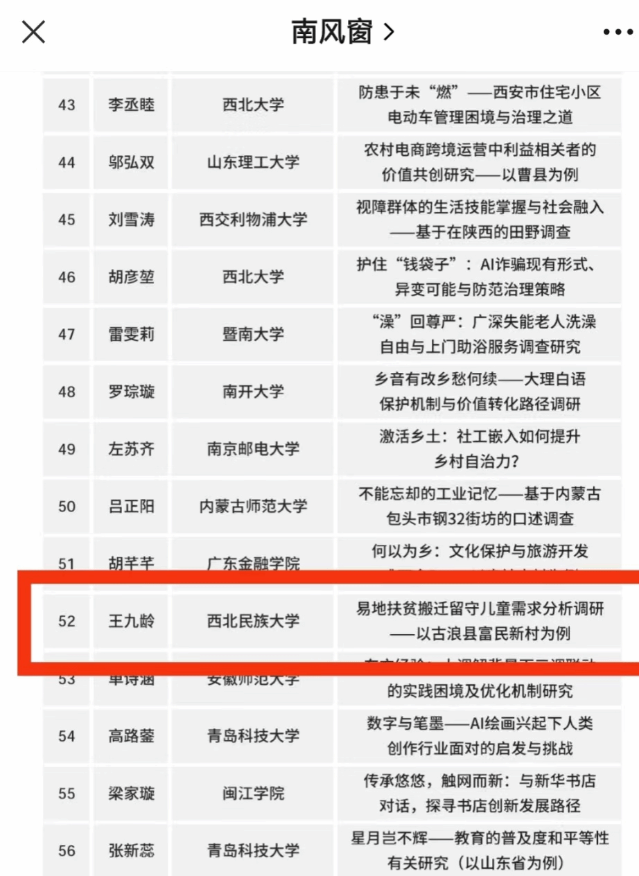 近日,南風窗雜志社主辦的2023“調研中國·青年領導力公益計劃”百強名單公布,由學院老師劉榮教授指導,22級社會工作專業王九齡同學申報的調研團隊項目《易地扶貧搬遷留守兒童需求分析調研--以古浪縣富民新村為例》入圍100強,榮獲“百強團隊”的榮譽稱號,并獲得調研資格,這是我院繼2018年入圍南風窗“調研中國”30強團隊之后又一次入選,希望今年我院入選的調研團隊在后續開展實地調研的過程中能夠再接再厲,取得更加優異的成績。