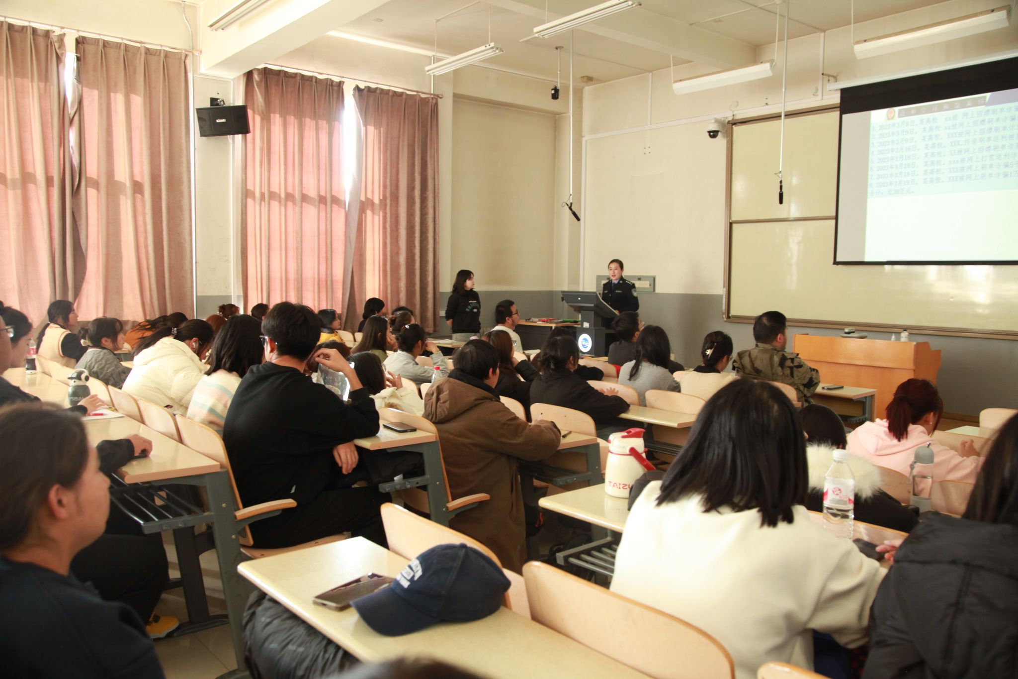 講座的主要內容是圍繞如何增強學生們的法律法規意識和自我保護能力,并結合本地實際,針對當前學生犯罪案件、各種事故的特點,對學生們進行以實用法律法規知識為主要內容的法律法規教育;通過事故分析,對學生們進行安全知識教育,提高大學生的安全意識、自我保護意識。