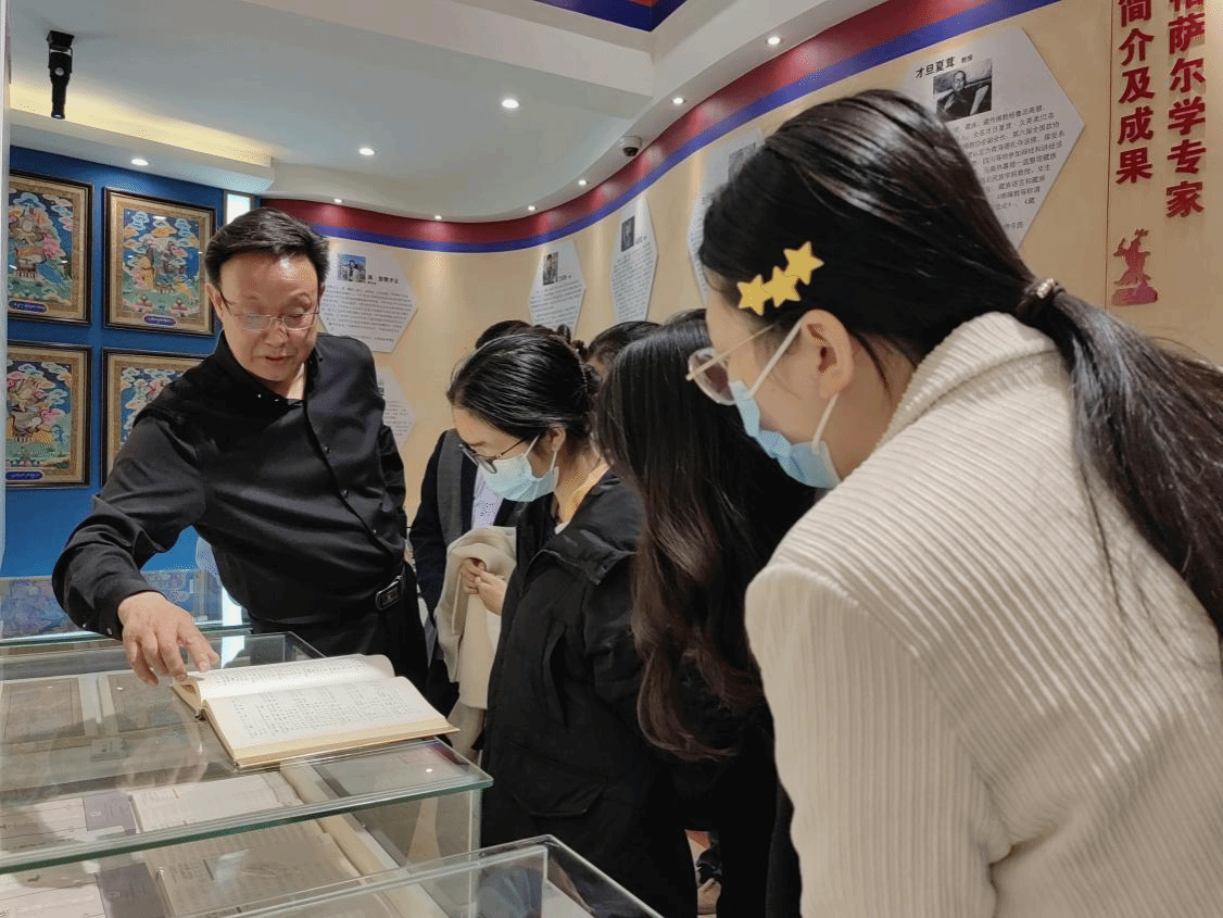 參觀期間,中國語言文學學部王國明研究員介紹了學校《格薩爾》研究團隊三代學者經60多年精誠協作、忘我地研究整理多民族傳承的《格薩爾》,面對史詩語言類別眾多、版本內容復雜,研究工作困難重重的局面,一路篳路藍縷,靜則甘坐冷板凳,精心研究,動則遍找說唱藝人,奮力搜集史詩資料,經年累月的搜集、精選、翻譯、注疏、校對、完善,2018年,集大成的3卷30冊約2500萬字的學術著作《格薩爾文庫》付梓。研究的標志性科研成果和集大成之作,為推動中華優秀傳統文化創造性轉化、創新性發展,提供了具有當代價值的文化精品,對構建中華民族共有精神家園,促進各民族交往交流交融,豐富鑄牢中華民族共同體意識的文化內涵具有重要意義。