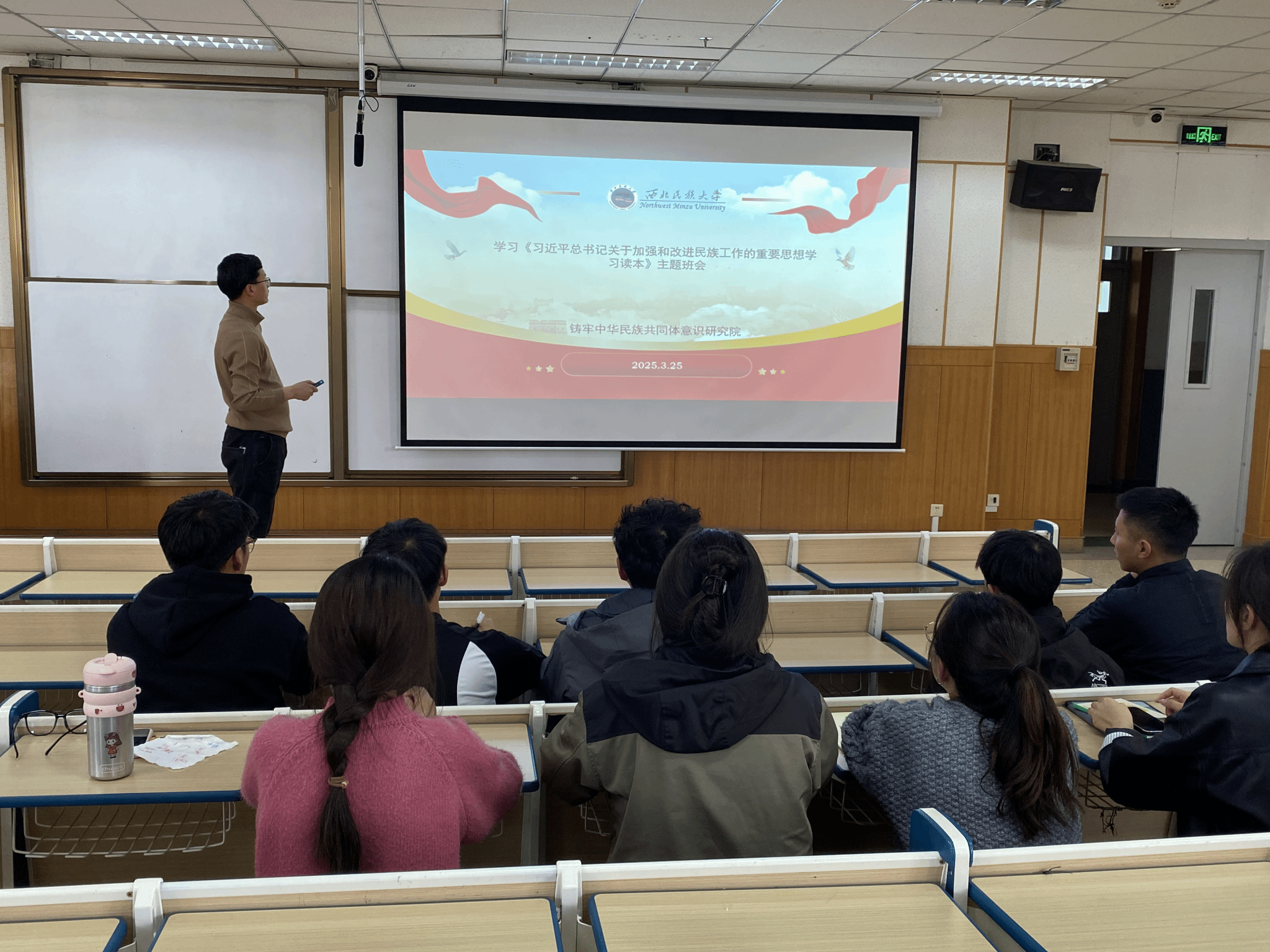 2025年3月至4月,鑄牢中華民族共同體意識研究院組織師生深入學習《習近平總書記關于加強和改進民族工作的重要思想學習讀本》。 研究院通過“三會一課”、主題黨日、主題班會、導師組會等形式,深入開展《讀本》學習研討,營造良好學習氛圍,推動黨的創新理論學習與專業學習相融相促,助力研究生增強使命擔當,牢固樹立休戚與共、榮辱與共、生死與共、命運與共的共同體理念,堅定對偉大祖國、中華民族、中華文化、中國共產黨、中國特色社會主義的高度認同。