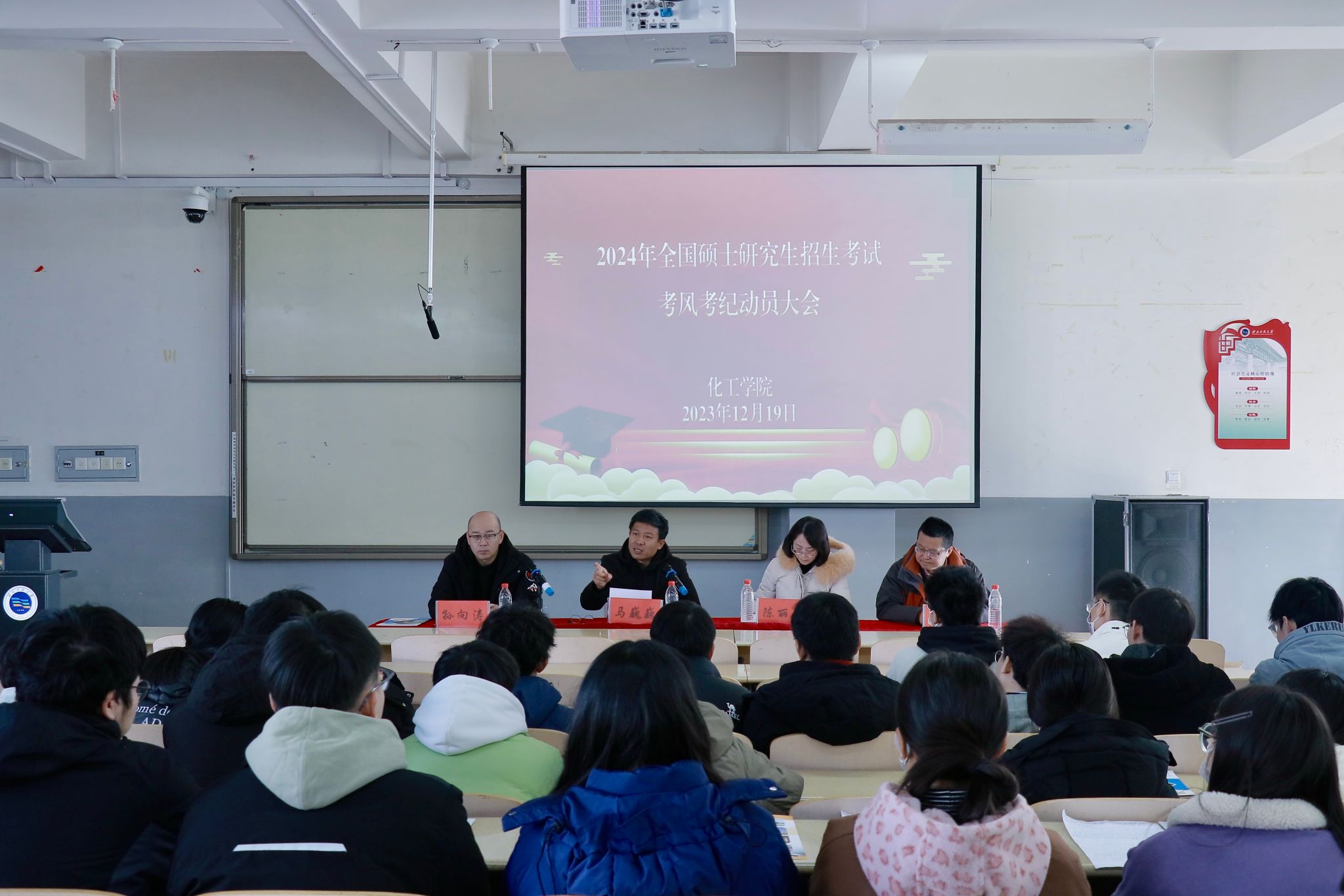 12月19日上午,化工學(xué)院在致真樓202召開2024年碩士研究生招生考試考風(fēng)考紀(jì)動員大會。學(xué)院黨委書記馬巍巍、院長陳麗華、副院長張宏出席會議,會議由黨委副書記孫向濤主持,全體輔導(dǎo)員以及報考2024年研究生考試的200余名學(xué)生參加。