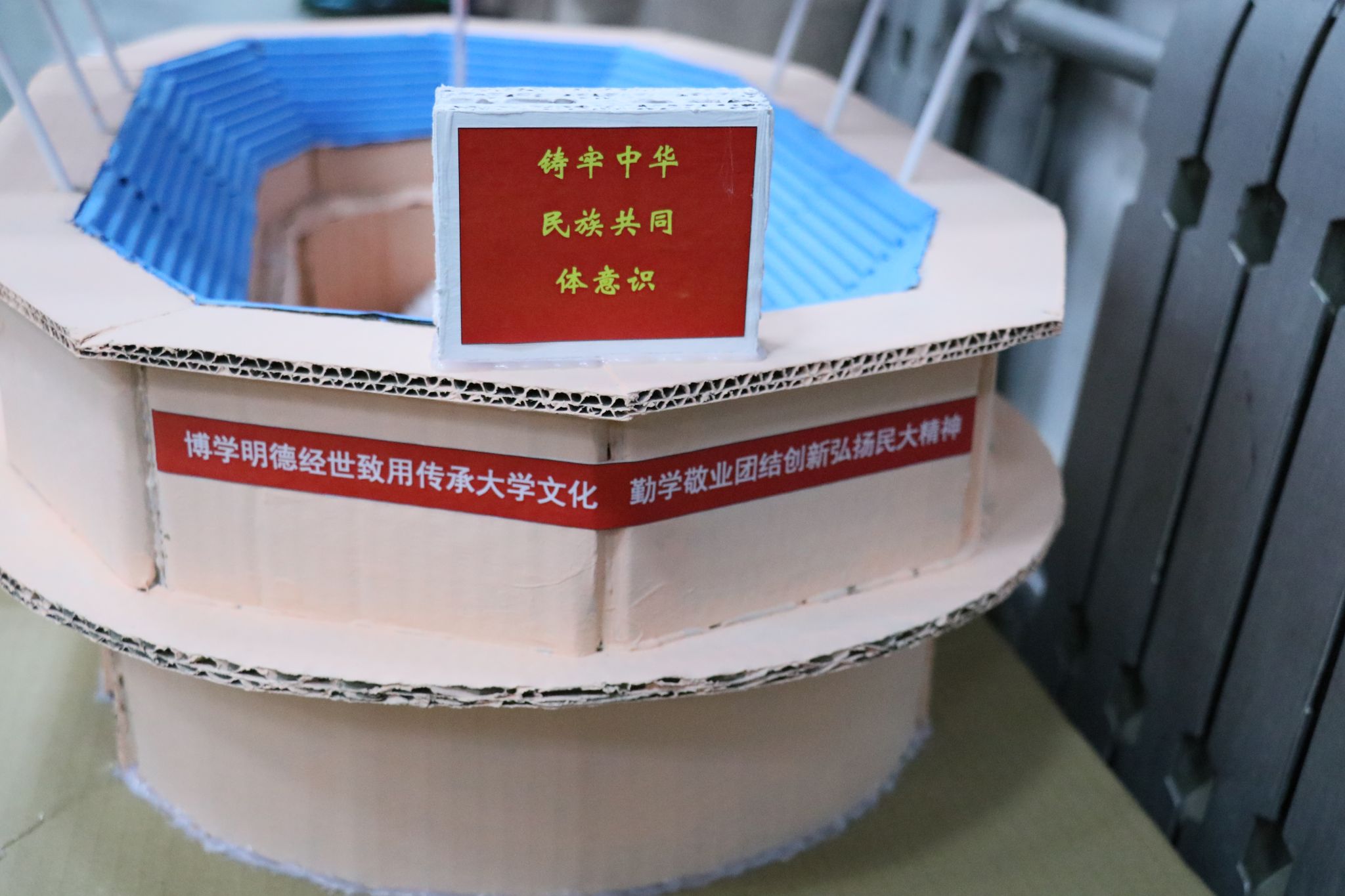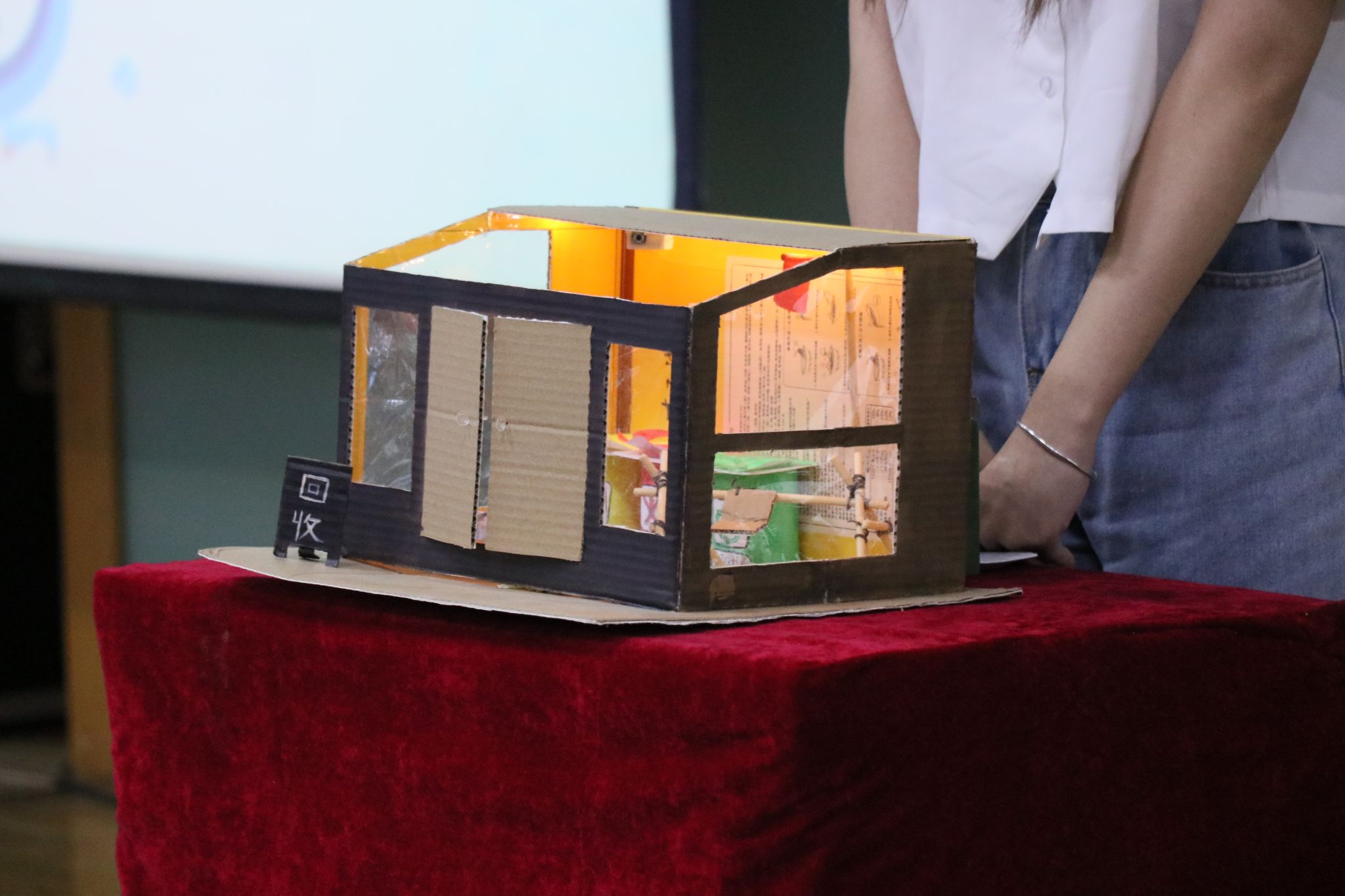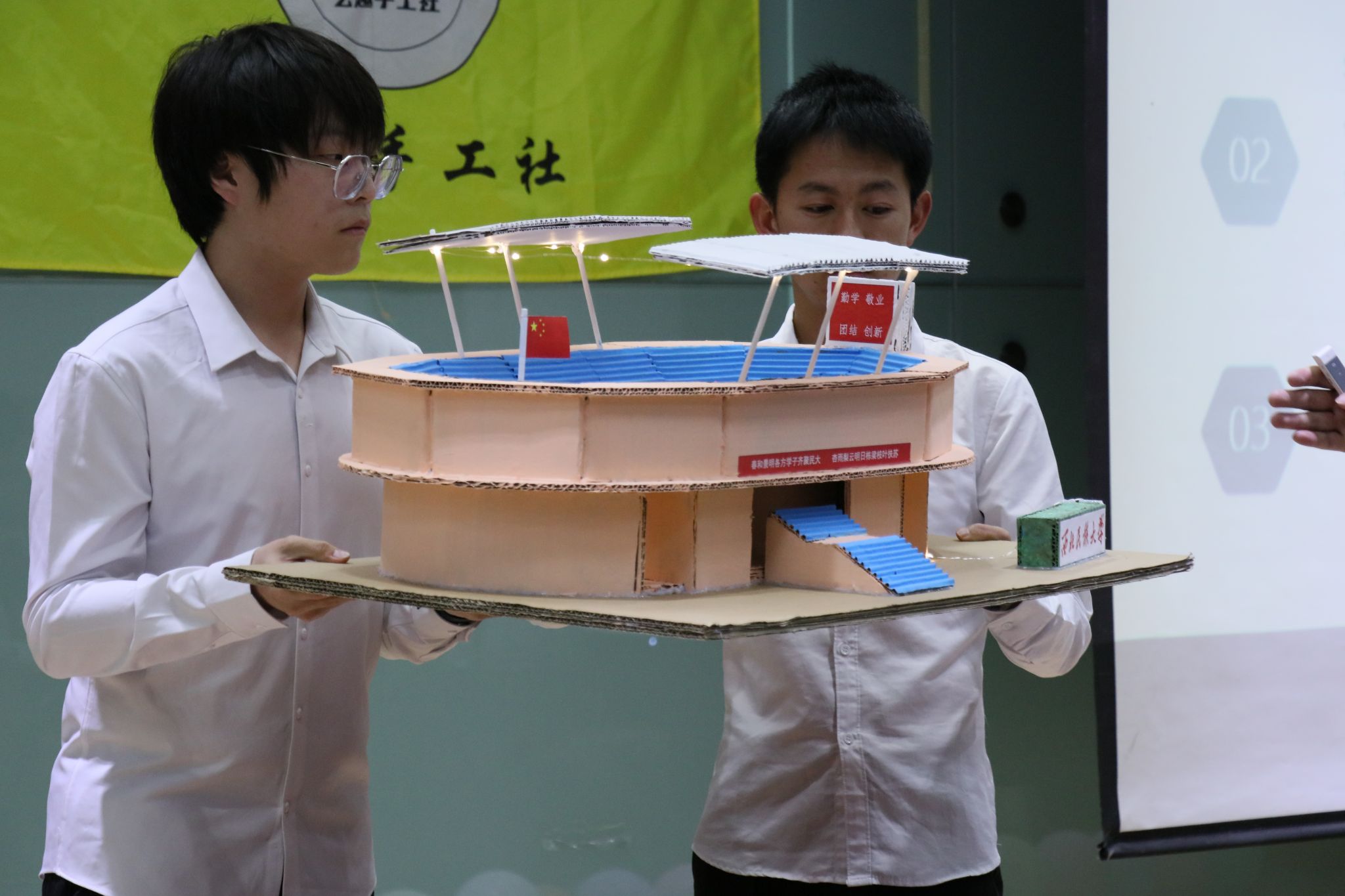 比賽現場,共有來自各學院的9支隊伍從初賽中脫穎而出,登上決賽舞臺。參賽作品形式多樣,選手們用自己的雙手和創意,將廢舊物品變廢為寶,打造出了一個個充滿創意和環保意義的作品。評審團對每個參賽作品進行了認真的評選和點評,最終,酸堿離子隊(化工學院)作品《民大小鳥巢》以其精湛的制作工藝和飽滿的內涵解說贏得本次大賽一等獎,知識青年隊(管理學院、歷史文化學院、體育學院)作品《紙獅子》、蛋仔派隊(化工學院)作品《清雅小院》獲二等獎,銀河護衛隊(管理學院)作品《摩天輪》、光宗耀祖隊(化工學院)作品《玫瑰花燈》、指望另一隊(化工學院)作品《紅色信仰》獲得三等獎,另評選出最佳實用獎、創意獎、優秀獎各一項。