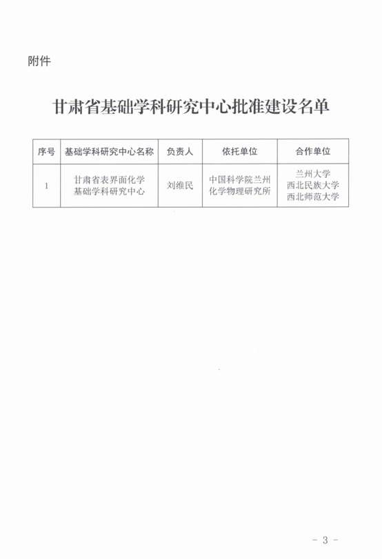 近日,甘肅省科技廳下發了《關于批準建設甘肅省表界面化學基礎學科研究中心的通知》,依托中國科學院蘭州化學物理研究所,由蘭州大學、西北民族大學、西北師范大學共同參與建設的甘肅省表界面化學基礎學科研究中心獲批立項建設。