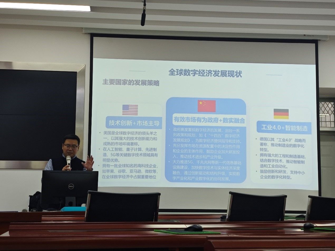 此次學術報告主要圍繞數字經濟發展脈絡、全球和中國數字經濟發展現狀以及數字經濟賦能高質量發展等方面進行全面闡析。陳南旭副教授強調數字經濟已經成為推動經濟高質量發展的主要驅動力之一,也是實現經濟轉型升級和創新驅動的重要途徑。加快發展數字經濟,不僅可以提升經濟整體效率和競爭力,還能促進就業和改善民生,陳南旭副教授結合自己多年的研究經驗和研究成果,為現場師生們分享了關于數字經濟發展的新理念思考。講座尾聲,陳南旭副教授結合科研實踐分享了相關研究領域論文寫作的新視角和新思路,并與在場師生進行了廣泛熱烈的交流。