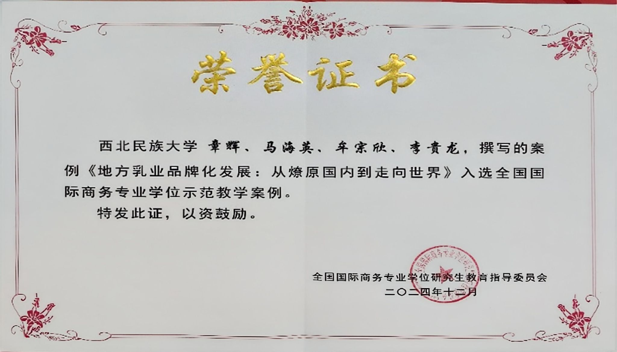 2024年全國國際商務專業學位研究生教育指導委員會示范教學案例遴選結果正式公布,經濟學院國際商務碩士生導師章輝教授、馬海英副教授及研究生牟宗欣、李貴龍撰寫的《地方乳業品牌化發展:從燎原國內到走向世界》成功入選,此次案例入選是經濟學院首次在國家級教學案例庫實現突破,也是省內相關專業教學案例首次入庫。