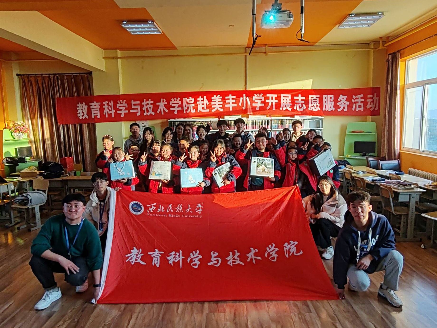在第38個國際志愿日來臨之際,2023年12月4日下午,教育科學與技術學院志愿服務小分隊赴夏官營鎮美豐實驗小學開展“愛心陪伴 陣地幫學”志愿服務活動。學院政治輔導員高潔老師帶隊,各年級志愿者學生代表參加。