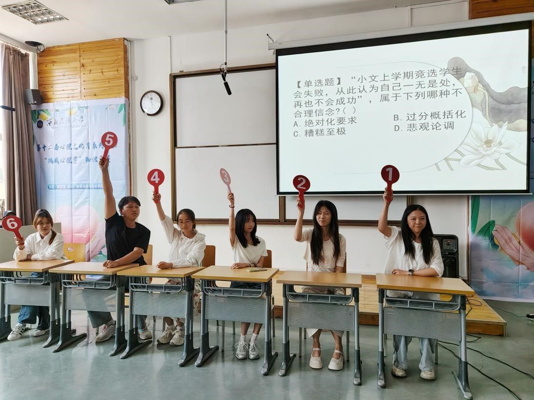 下半場“知識搶答”將比賽推向高潮。選手們眼疾手快、沉著應戰,展現出扎實的專業功底和敏銳的應變能力。臺上比分你追我趕,臺下觀眾屏息凝神,每一次精彩作答都引發熱烈掌聲。活動中還展播了第十二屆心理文化月心理健康科普短視頻大賽獲獎作品《褪“郁”新生》《白熊效應科普視頻》《心繭 共振》,這些作品以青年人喜聞樂見的形式傳播心理健康知識,幫助同學們重視心理健康,掌握自我調適技巧。
