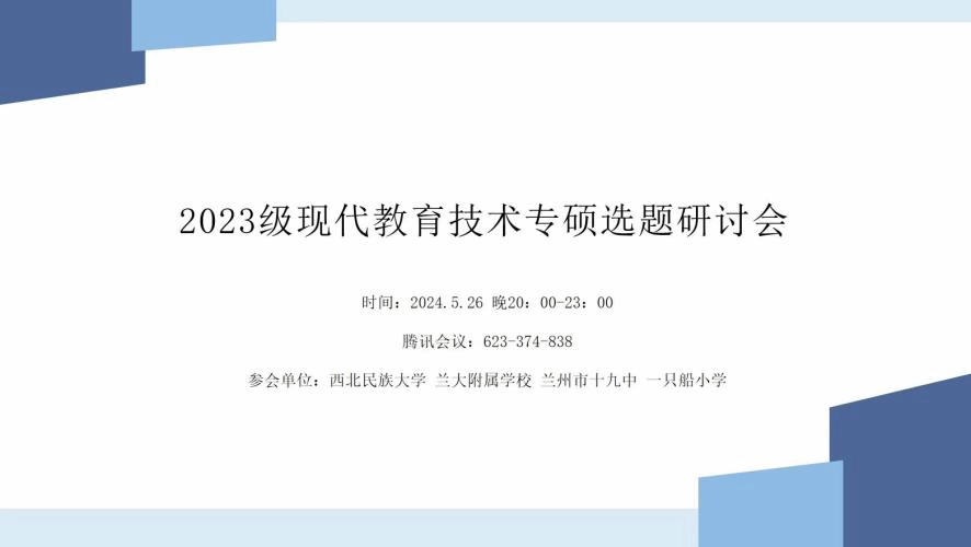 5月26日晚上八點,教育科學與技術學院精心策劃的“2023級現(xiàn)代教育技術專業(yè)碩士選題培訓會”以線上形式召開。參加本次研討會的有教育科學與技術學院現(xiàn)代教育技術專碩的校外導師:蘭大附屬學校校長楊永宏、一只船小學校長張文博、蘭州市十九中石之昌老師。校內(nèi)導師和2023級現(xiàn)代教育技術專業(yè)全體碩士研究生。