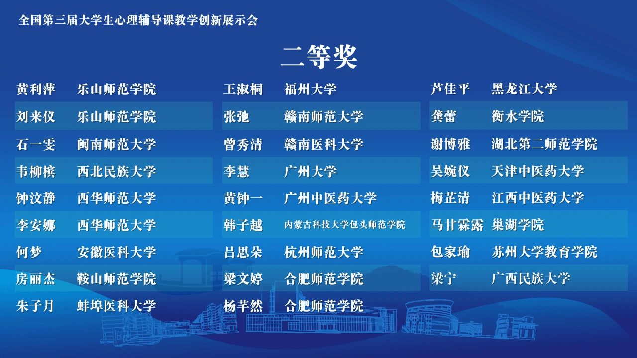4月26日,教育部高等學(xué)校心理學(xué)類專業(yè)教學(xué)指導(dǎo)委員會和中國心理學(xué)會聯(lián)合主辦,華東師范大學(xué)和浙江師范大學(xué)承辦全國第三屆大學(xué)生心理輔導(dǎo)課教學(xué)創(chuàng)新展示會在浙江桐鄉(xiāng)落下帷幕。本屆大賽分為初賽和決賽兩個階段,共有來自全國156所高校的288個選手參賽,經(jīng)過激烈角逐,最終有99所院校144名選手入圍決賽,決賽包括現(xiàn)場說課和授課兩個環(huán)節(jié),我院應(yīng)用心理學(xué)專業(yè)2021級1班韋柳檳同學(xué)進(jìn)入決賽并榮獲二等獎。