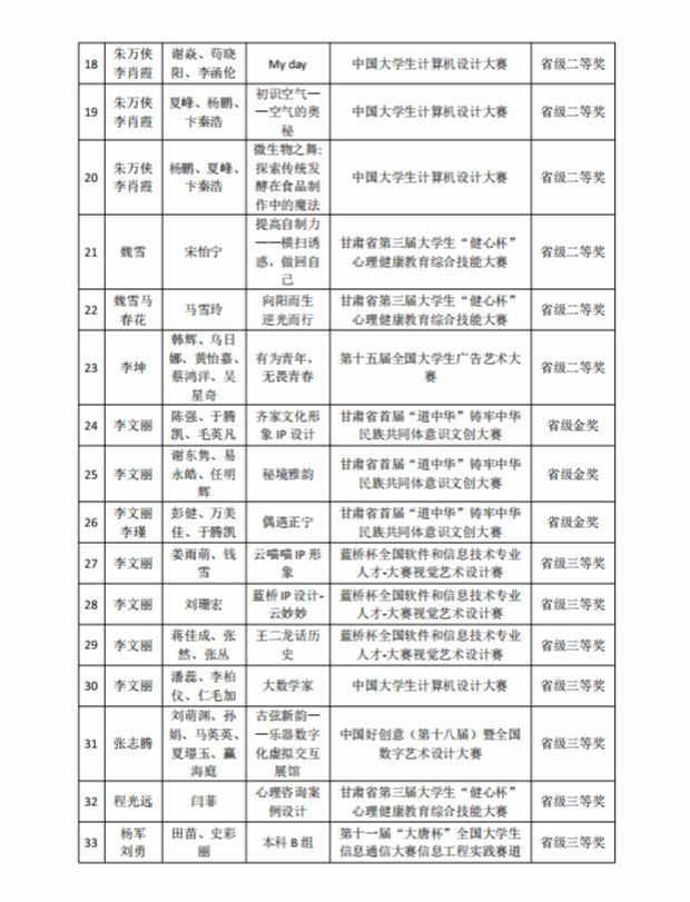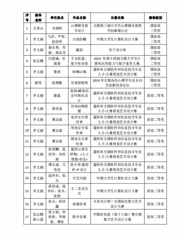 近日,教育科學與技術學院學生在“藍橋杯”全國軟件和信息技術專業人才-大賽視覺藝術設計賽、中國大學生計算機設計大賽、未來設計師·全國高校數字藝術設計大賽、米蘭設計周、第十八屆中國好創意暨全國數字藝術設計大賽、第十五屆全國大學生廣告藝術大賽、第十一屆“大唐杯”全國大學生信息通信大賽信息工程實踐賽道、甘肅省第三屆大學生“健心杯”心理健康教育綜合技能大賽、甘肅省首屆“道中華”鑄牢中華民族共同體意識文創大賽等各類學科競賽中榮獲4個全國二等獎、2個全國三等獎、以及多項省級獎項的出色成績,為學校和學院贏得了的榮譽。這充分說明學院在狠抓實踐教學,培養學生實踐能力方面取得了顯著成效。學院將繼續以賽促學、以賽促教,助力師生共同成長!具體名單見附件: