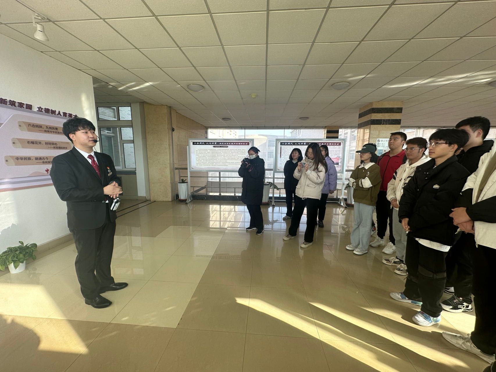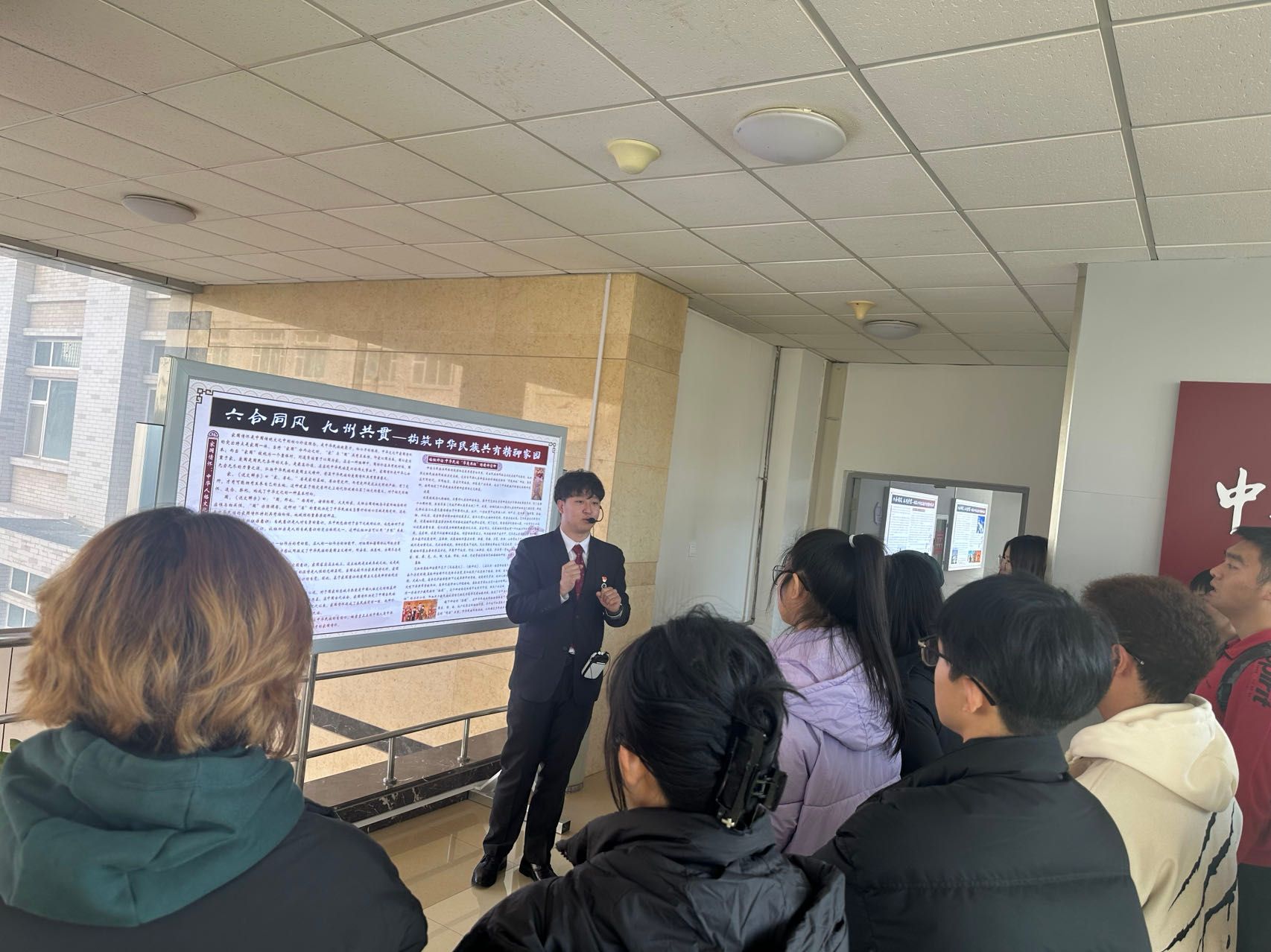 為引導學院師生更好地把鑄牢中華民族共同體意識教育融入大學生學習生活。11月29日下午14:30,學院輔導員李皎老師,學生代表30余人前往致善樓參觀“鑄牢中華民族共同體意識教育課程思政案例展”,本次參觀邀請了中華民族共同體學院2021級社會學2班喻子懿同學擔任講解員進行講解。