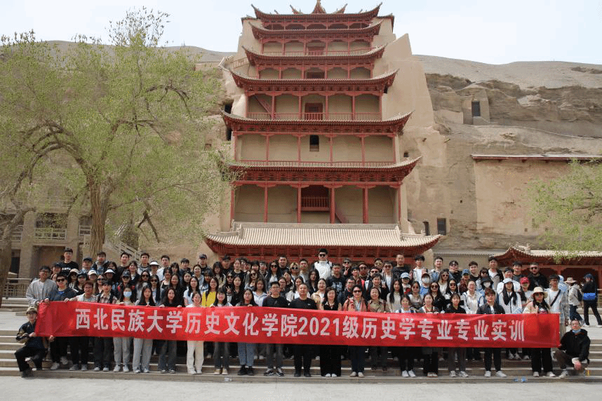 2021級(jí)歷史學(xué)專(zhuān)業(yè)實(shí)訓(xùn)小隊(duì)在敦煌莫高窟前合影
