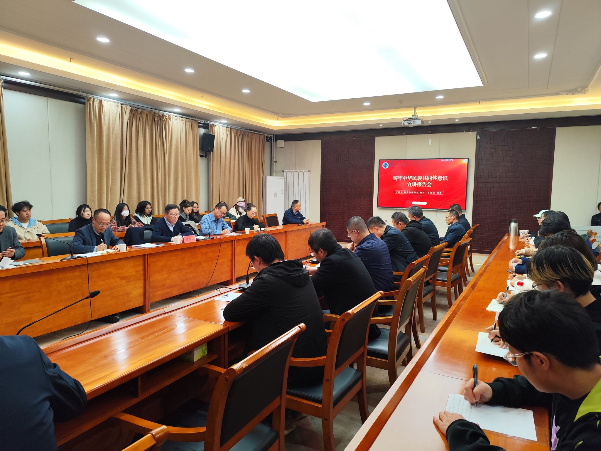 10月25日下午,校黨委副書記、校長王彥斌,在禮堂東廳為聯系單位:教務處、歷史文化學院、中國民族信息技術研究院教職工和聯系班級學生宣講鑄牢中華民族共同體意識。