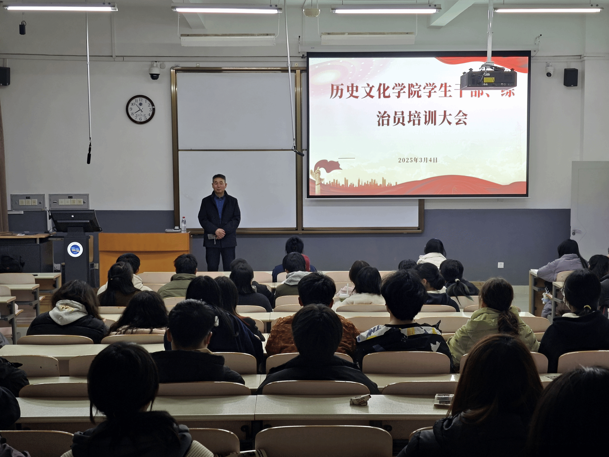 2025年3月4日,歷史文化學(xué)院在致真樓206教室召開(kāi)全體學(xué)生干部及綜合治理員大會(huì),學(xué)院學(xué)生工作辦公室主任王振忠主持會(huì)議。會(huì)議聚焦"以身作則、發(fā)揮作用、積極實(shí)踐"三大主題,強(qiáng)調(diào)學(xué)生干部和綜合治理員在學(xué)生管理及維護(hù)校園安全穩(wěn)定中的引領(lǐng)作用。