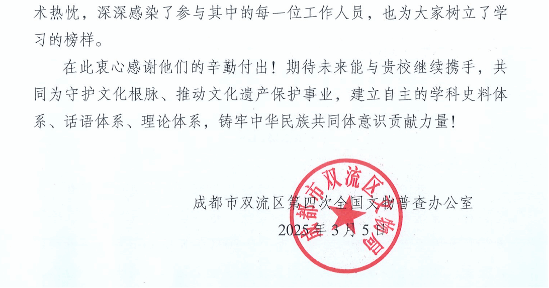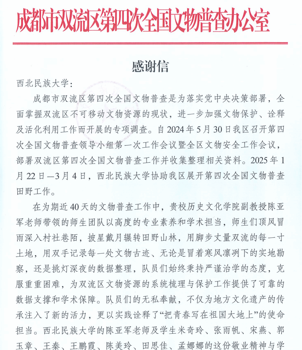 為了更好貫徹落實新時代黨的文物工作方針,踐行國家民委和國家文物局的合作協(xié)議,充分發(fā)揮文物考古在鑄牢中華民族共同體意識、加強中華民族共同體建設中的重要作用。學院以全國第四次文物普查為契機,與兄弟院校、地方文物單位聯(lián)合組成普查工作隊,在協(xié)力推進了成都市文物普查工作的同時,為摸清文物家底、賡續(xù)歷史文脈,抒寫了時代華章。
