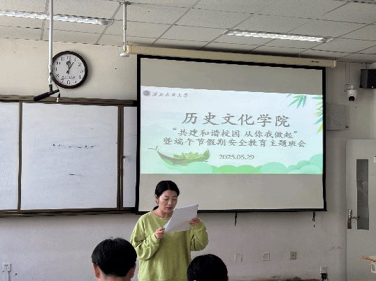為增強學生的安全意識,營造和諧穩定的校園環境,5月29日,歷史文化學院在致善樓206舉行“共建和諧校園 從你我做起”暨端午節假期安全教育主題班會。此次主題班會由學院分管研究生工作的吳通副院長與科研干事陳芳老師主持,2023級和2024級全體研究生參與了此次班會。