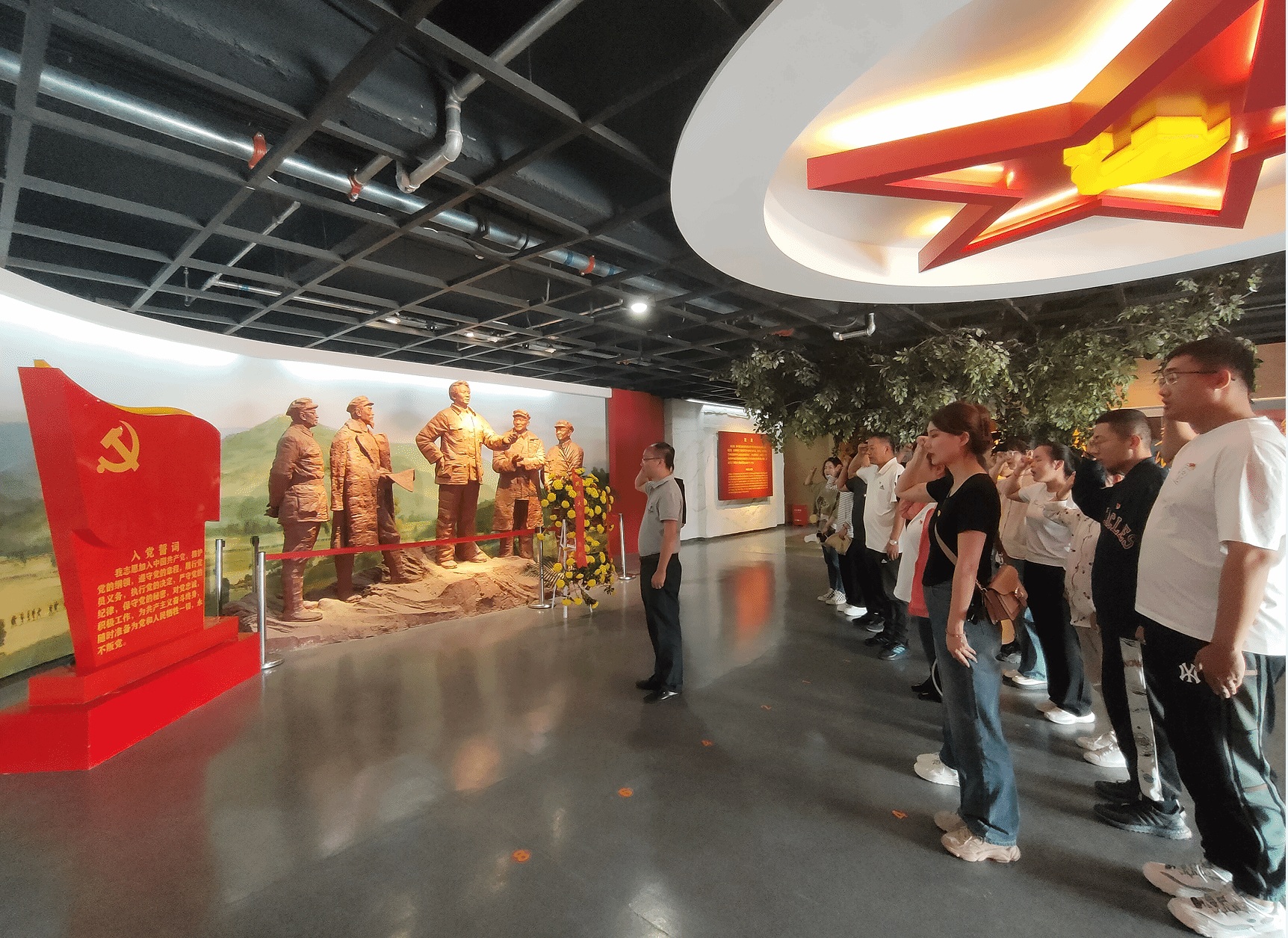 在哈達(dá)鋪紅軍長征紀(jì)念館偉人雕像前,全體黨員整齊肅立,向革命先烈行三鞠躬禮,學(xué)院張緯老師、楊永鋒老師敬獻花籃并整理緞帶,隨后由楊永鋒老師領(lǐng)誓,全體黨員擲地有聲地重溫了入黨誓詞。伴隨著紀(jì)念館講解員聲情并茂的講解和館內(nèi)詳實的史料,全體黨員一邊聆聽老一輩無產(chǎn)階級革命家浴血奮戰(zhàn)的英雄事跡,一邊仔細(xì)瞻仰館內(nèi)的歷史圖片資料和實物展品,共同重溫了紅軍波瀾壯闊、艱苦卓絕的長征歷程,回顧了以毛澤東主席為核心的黨的第一代中央領(lǐng)導(dǎo)集體為黨和人民事業(yè)取得的每一個重大勝利付出了巨大心血,作出了卓越貢獻,更加深化了對于長征精神的理解。參觀完畢后,全體黨員來到紀(jì)念碑處瞻仰,正午的陽關(guān)照射在雄偉的紀(jì)念碑之上,泛起陣陣金光,仿佛在無聲地訴說著這段光榮的歲月。