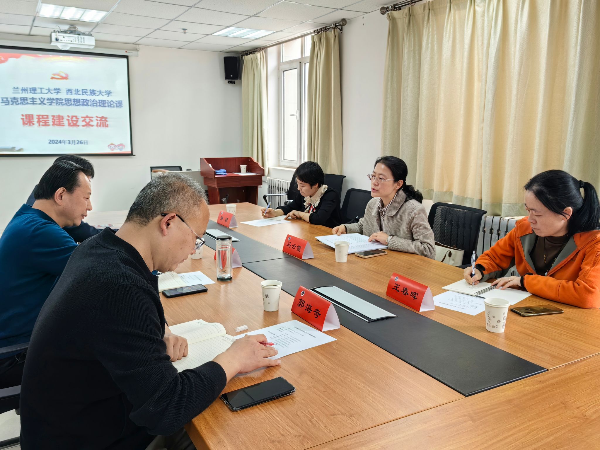 楊建毅代表學(xué)院對(duì)理工大同仁來訪表示歡迎,他總體介紹了西北民族大學(xué)思政課課程基本情況與教學(xué)改革經(jīng)驗(yàn)。廉武輝感謝理工大馬院多年來對(duì)全省高校“形勢(shì)與政策”課程建設(shè)的大力支持,他詳細(xì)介紹了我校形勢(shì)與政策教育教學(xué)的制度建設(shè)、課程運(yùn)行、專題選擇、師資遴選、集體備課等具體工作。雙方圍繞思政課建設(shè)中遇到的實(shí)際問題,以及實(shí)踐教學(xué)開展模式等共同關(guān)心的諸多進(jìn)行了深入的交流和探討。