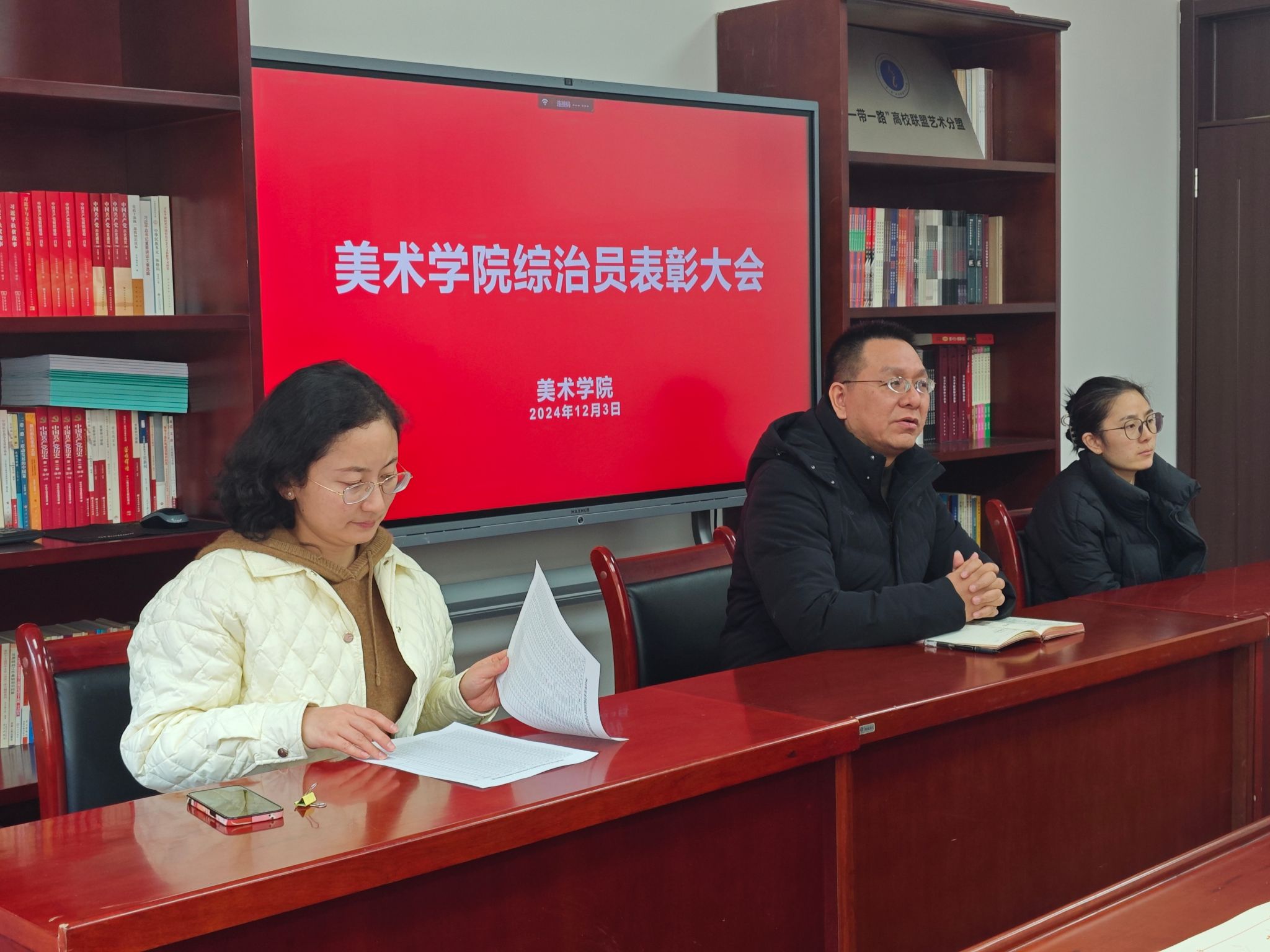 為牢固樹立學生安全意識,更好地開展平安校園建設工作, 2024年12月3日,美術學院在美術樓209會議室開展綜治員表彰大會。學院黨委書記蘇知洋、研究生干事謝建英以及全體優秀綜治員參加,大會由團委書記王媛媛主持。