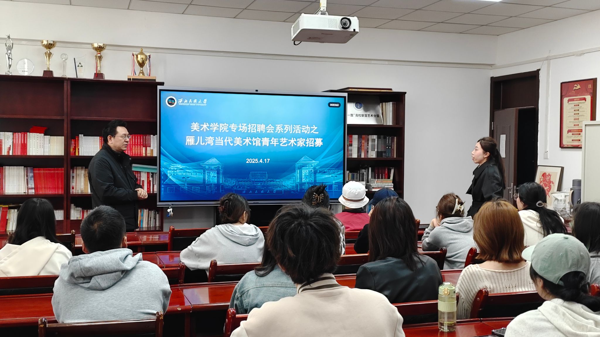 為深化校企合作,提升學生就業(yè)競爭力與綜合實踐能力,美術(shù)學院于2025年4月17日在美術(shù)樓209會議室成功舉辦“敦煌創(chuàng)藝樞”“青年藝術(shù)家”就業(yè)宣講招聘會。本次宣講招聘會由美術(shù)學院黨委書記蘇知洋主持,雁兒灣當代藝術(shù)館招聘團隊及美術(shù)學院畢業(yè)生共同參與。