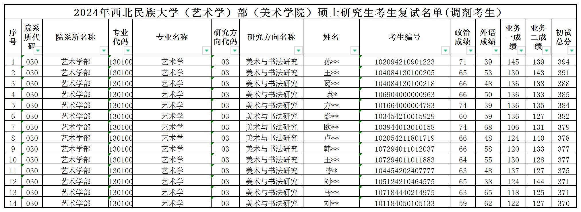 2024年西北民族大學(藝術學)部(美術學院)碩士研究生考生復試名單(調劑考生)