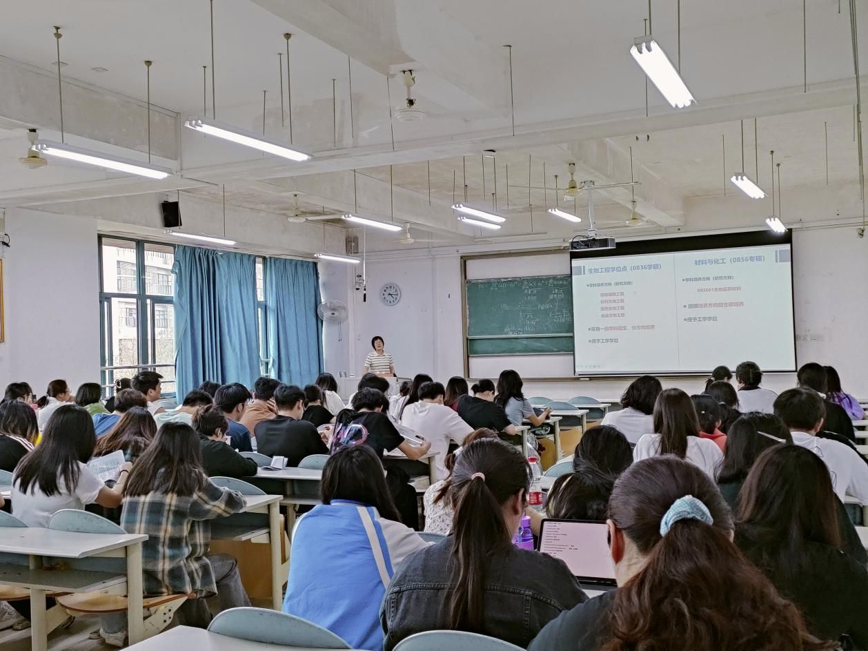 田曉靜與柳州工學院食品與化學工程學院教授熊建文、助理研究員韋瀟麗就學科專業、學生考研等情況進行了座談交流,為學生們詳細介紹了學校生物工程一級學科碩士點基本情況,研究生王倩玉、張韋楠就生物工程一志愿報考、調劑等與在座學生進行了分享交流。柳州工學院相關專業學生50余人參加了宣講會。