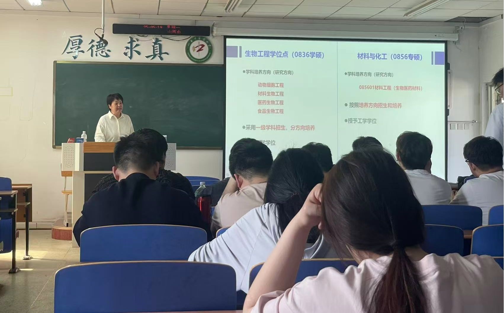 宣講團(tuán)介紹了生物工程學(xué)科科研團(tuán)隊(duì)、科研平臺(tái)、代表性研究成果和人才培養(yǎng)措施及成效,重點(diǎn)介紹了生物工程一級(jí)學(xué)科學(xué)術(shù)型碩士和材料與化工專(zhuān)業(yè)型碩士學(xué)位點(diǎn)招生政策。