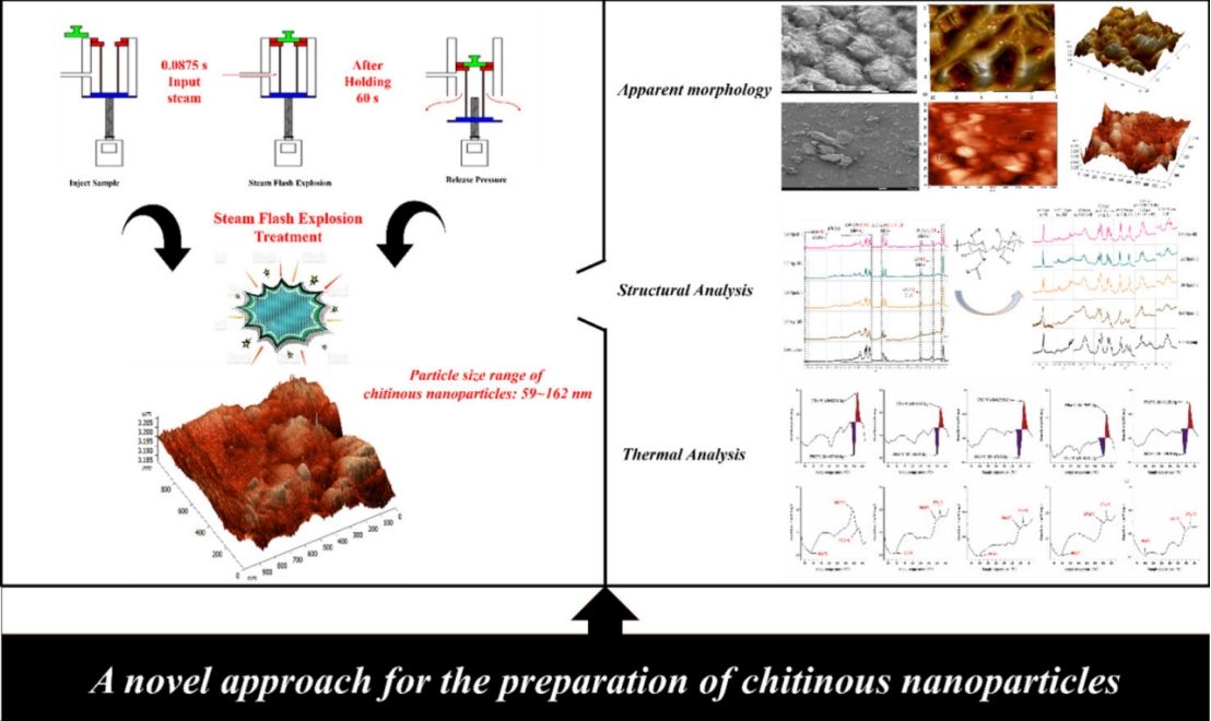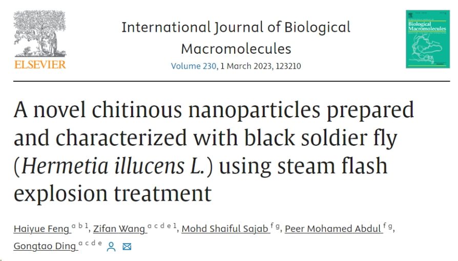 西北民族大學生物醫學中心生物制藥與材料工程創新團隊在國際學術期刊International Journal of Biological Macromolecules在線發表題為“A novel chitinous nanoparticles prepared and characterized with black soldier fly (Hermetia illucens L.) using steam flash explosion treatment”的研究論文。該論文首次提出使用蒸汽閃爆裝置一步制備黑水虻殼聚糖納米顆粒的方法,為深入了解如何高效制備生物質納米顆粒及潛在的生物質納米遞送組裝系統提供新的見解。