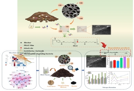該系列研究針對目前大量產(chǎn)生的以PBAT(聚己二酸對苯二酸丁二醇酯)為主要原料的可生物降解塑料的不完全降解帶來的生態(tài)安全性問題,先后開發(fā)了硫酸亞鐵結(jié)合炭載固氮菌(Bacillus subtilis subsp) 和生物炭聯(lián)合固氮菌(Azotobacter vinelandii)兩種生物復(fù)合材料,這兩種復(fù)合材料均具有顯著提高氮保留率、加速PBAT的降解的作用。同時,采用EPR、FTIR、XPS、GC-MS等表征方法監(jiān)測了復(fù)合物對PBAT基塑料在好氧堆肥體系中的動態(tài)降解過程,并對碳氮排放、氮素轉(zhuǎn)化、生態(tài)毒性和微生物群落演替等方面進(jìn)行了分析,探究了兩種材料對PBAT的降解機(jī)理。該研究不僅為新型可生物降解塑料的發(fā)展提供了有效的管理策略, 也為不合理處理新型塑料產(chǎn)生的溫室氣體排放的管理方面提供了新的視角。