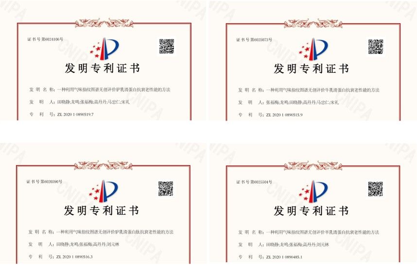 針對乳清蛋白體內功能評價對實驗動物的依賴大、需處死實驗動物以獲取生理生化及形態學指標等問題,生物醫學研究中心食品生物技術團隊利用氣味指紋圖譜建立了無創評價牛、羊、驢乳清蛋白及驢乳清蛋白肽抗衰老性能的方法,授權發明專利4件。