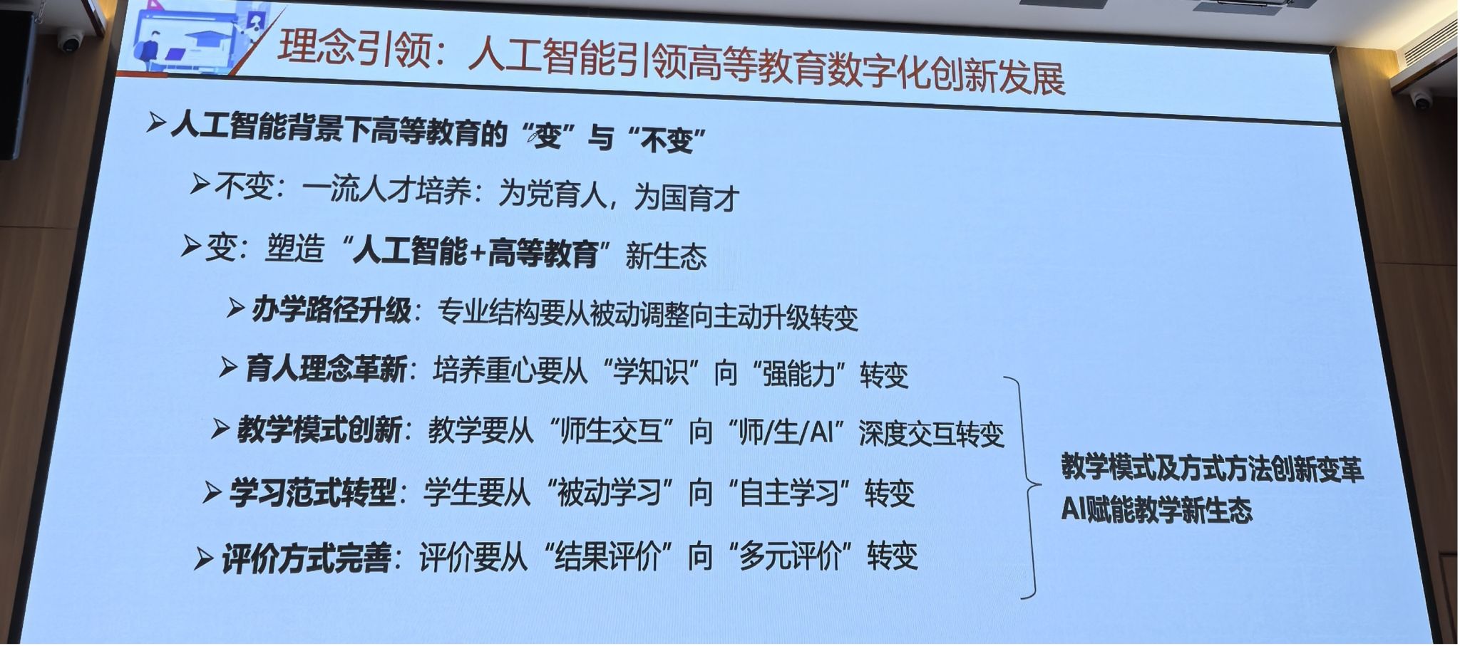參會老師集中聆聽學習《轉變教育教學觀念背景下教師數字素養發展與AI賦能教學創新設計與實踐》和《數字化轉型背景下構建師生相長的課程思政生態社區》主題報告,主要圍繞轉變教育教學理念,使教師能夠有效利用數字智能技術獲取、加工、使用、管理和評價數字信息和資源,進行數字課程設計建設;能夠有效利用數字智能技術發現、分析和解決教育教學問題,開展數智賦能教學,實現提升一流人才培養質量的教學重構設計、教學實踐的思維與能力。