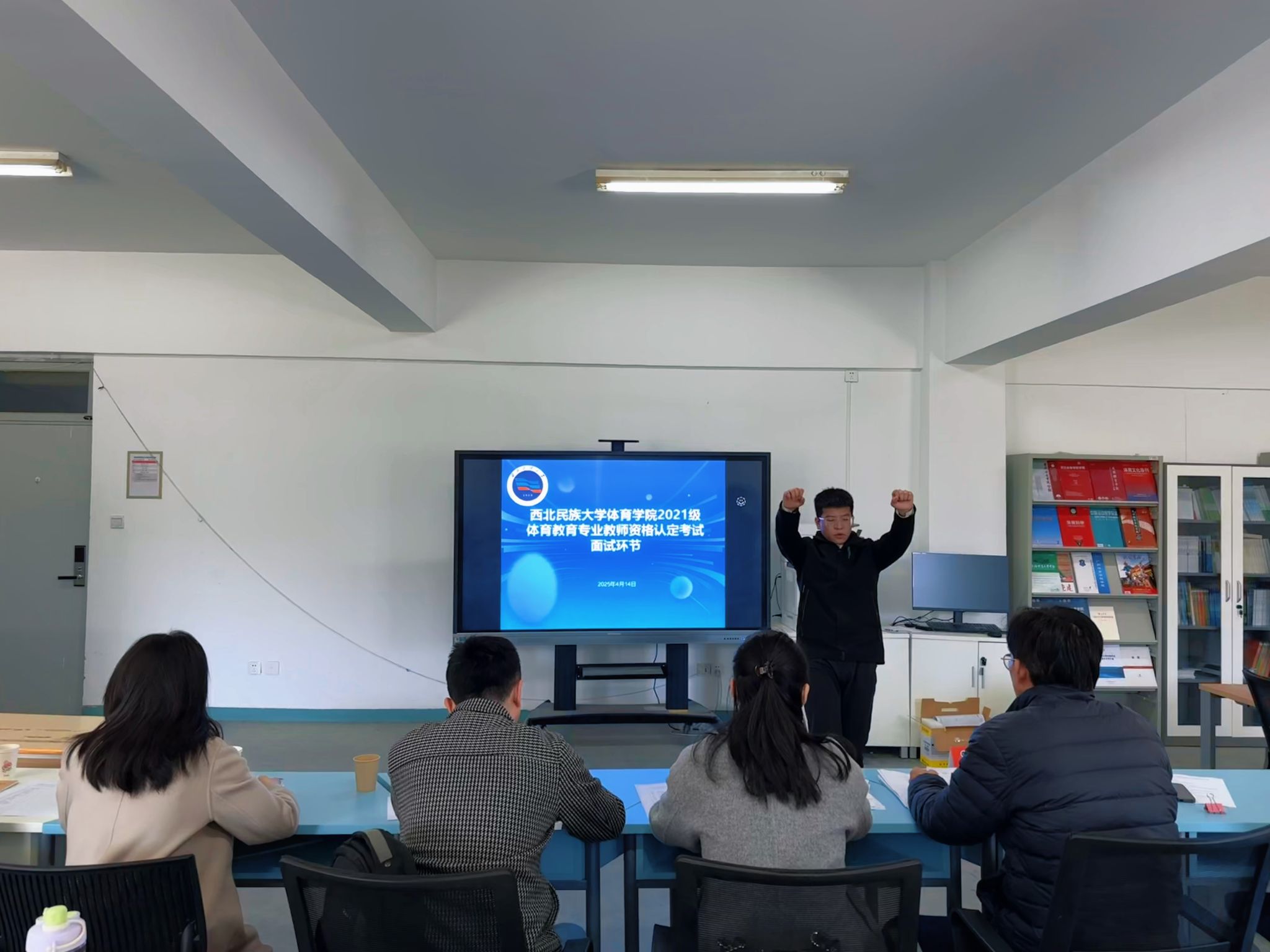 為全面提升師范類專業學生學科素養與教學能力,優化教師資格考試工作,體育學院于4月14日組織開展了2021級體育教育專業學生教師資格面試考試工作。邀請了蘭州城市學院體育學院院長孫輝、西北師范大學體育學院副院長李斌、西北師范大學體育學院副院長趙薇、蘭州十一中教育集團體育教師張愛軍、蘭州市第十九中學教育集團體育教師王雪紅與校內部分教師共同擔任評委工作。
