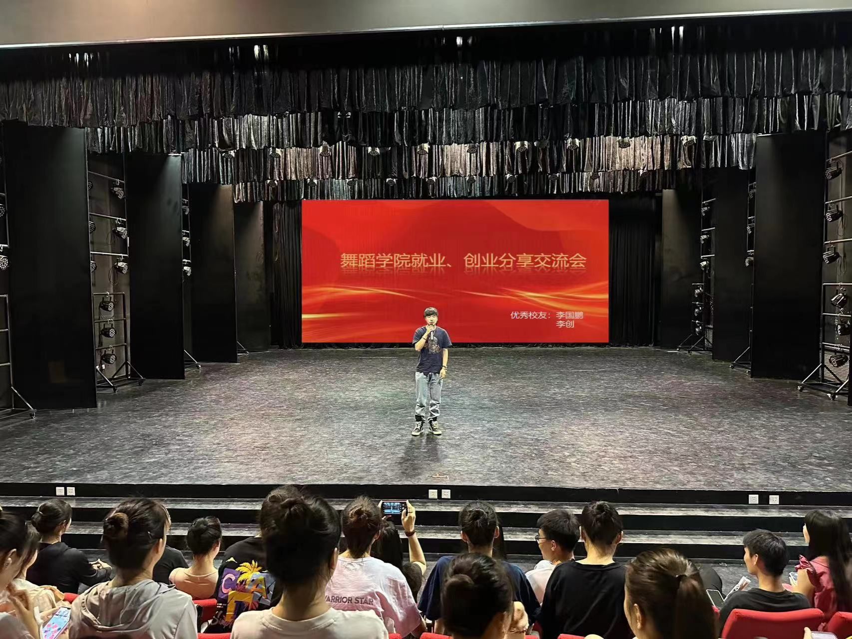為進一步發揮優秀畢業生的榜樣引領作用,拓展學生職業發展視野與思路, 6月13日,舞蹈學院在舞蹈樓小劇場舉辦了優秀畢業生“‘職’點迷津”——就業、創業經驗分享交流會。學院2018級舞蹈學專業校友李國鵬、李創應邀返校為學弟學妹們分享經驗。2021級全體本科生參加了交流會。
