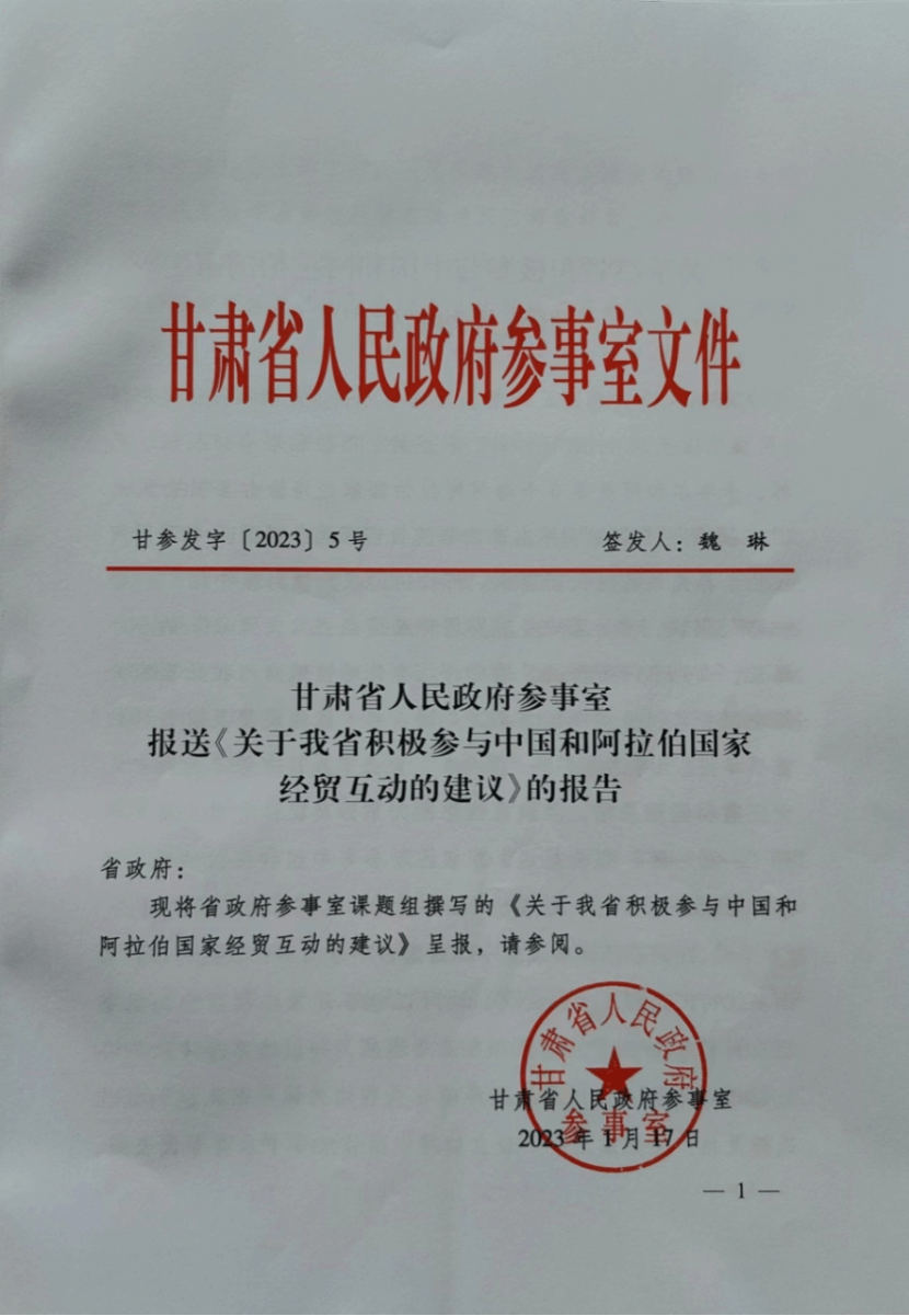 學院馬和斌教授依據學術研究的積淀,積極構想甘肅省有針對性地向阿拉伯國家輸出中國智慧和提供中國方案,參與完成的《關于我省積極參與中國和阿拉伯國家經貿互動的建議》得到省領導的肯定性批示。隨后,甘肅省人民政府參事室和甘肅省政府外事辦就該“建議”聯合召開座談會,聽取推動建議實施的具體意見;貫徹落實黨的二十大精神,積極推動甘肅高水平對外開放和高質量發展。