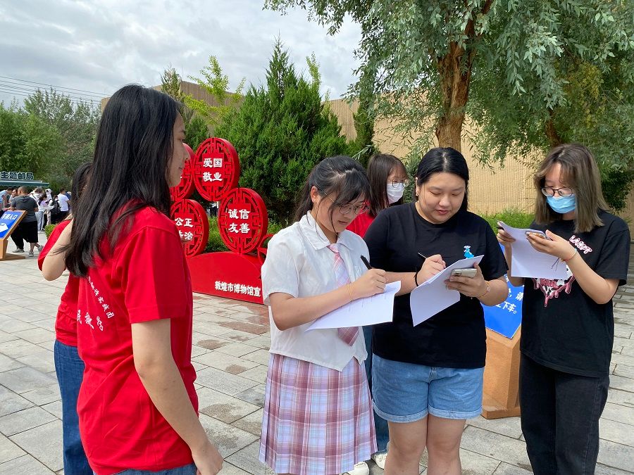 在問卷調(diào)查過程中,文旅翻譯實踐團(tuán)成員們不懼烈日,在完成既定的翻譯實踐調(diào)研任務(wù)后,實踐團(tuán)成員們在實踐點附近向當(dāng)?shù)鼐用瘛⒂^光游客分發(fā)調(diào)查問卷,并進(jìn)行深入的訪談交流。更深入地了解以敦煌文化為代表的中華優(yōu)秀傳統(tǒng)文化的翻譯現(xiàn)狀和傳播狀況以及紅色故事在敦煌當(dāng)?shù)氐膫鞑デ闆r,為調(diào)研數(shù)據(jù)的收集以及后期調(diào)研報告的撰寫奠定了堅實的基礎(chǔ)。